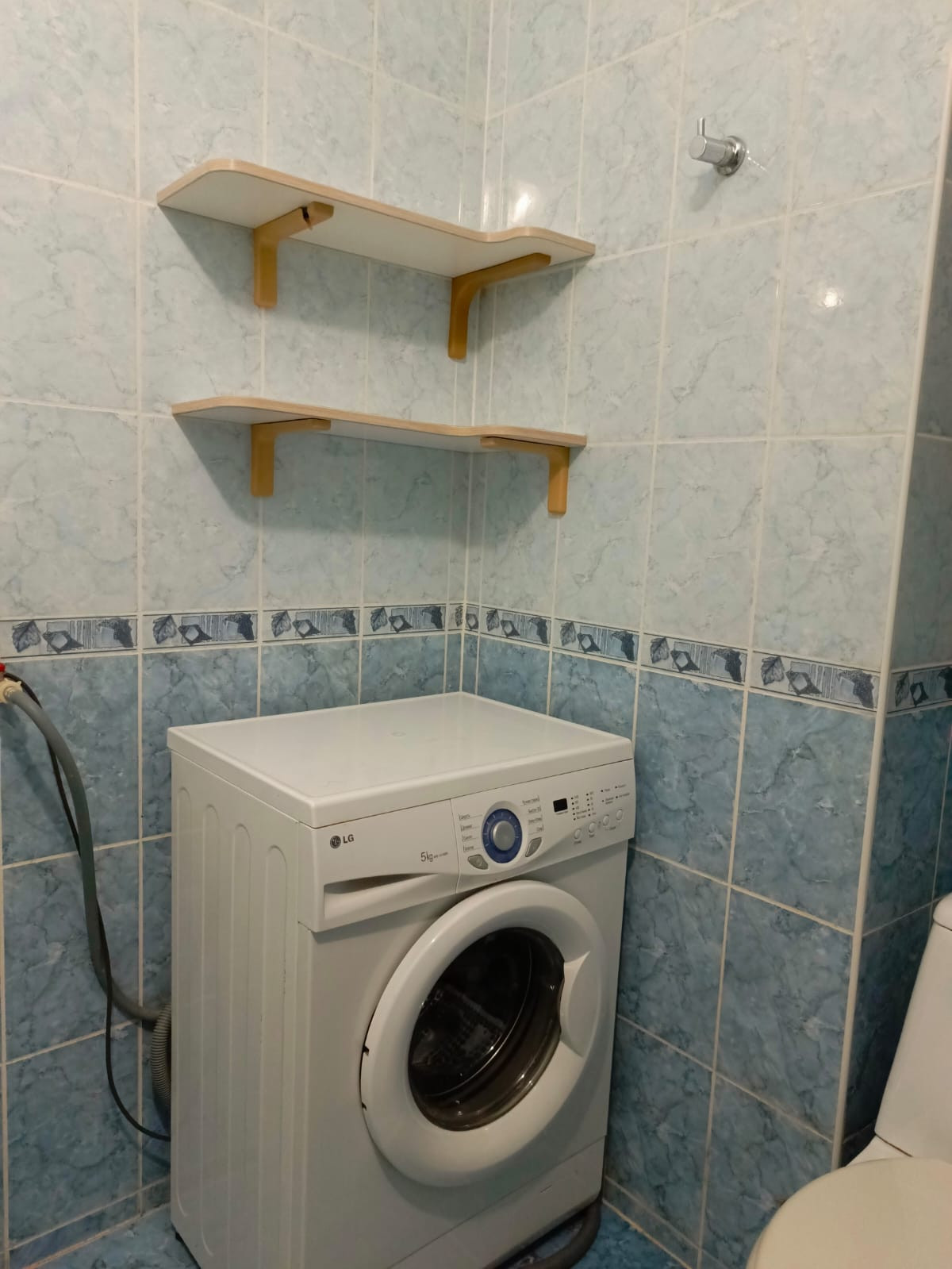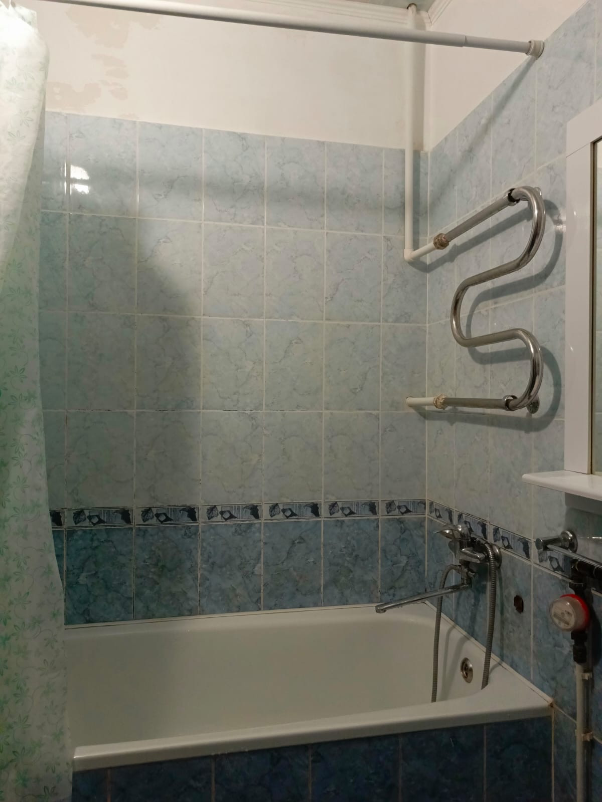В ванной полотенцесушитель, полки, шкаф навесной, только ванна, раковины нет.
