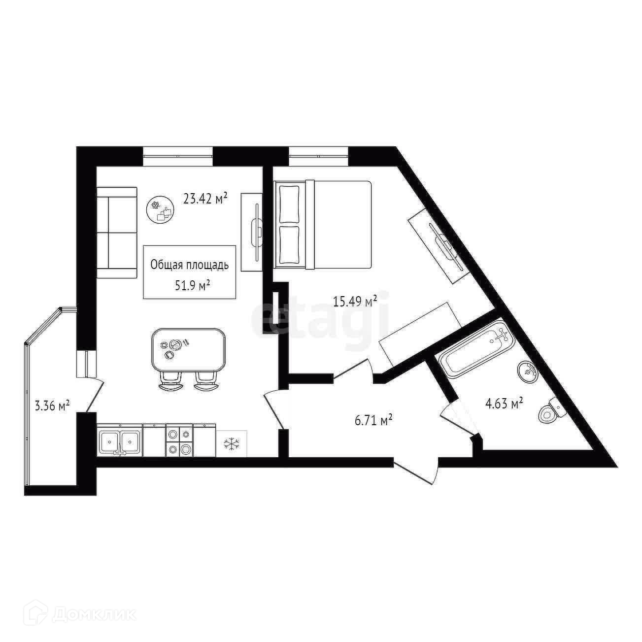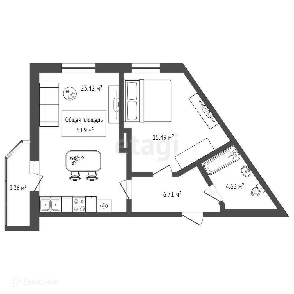 Общая площадь 51.9 м2