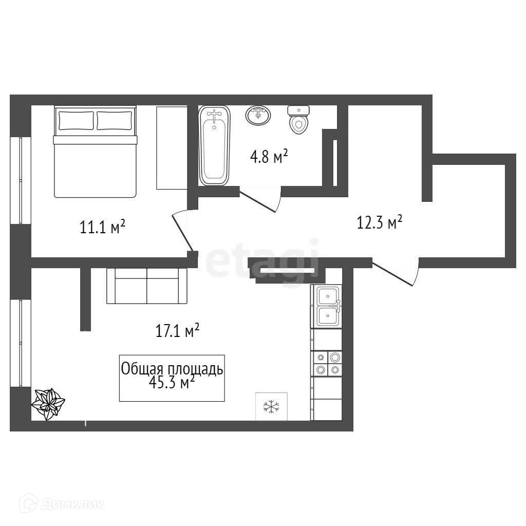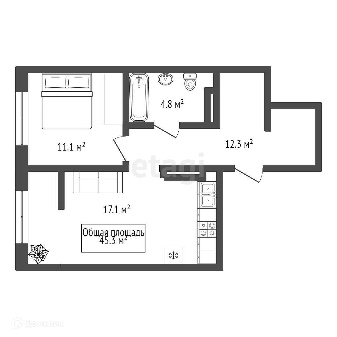 Общая площадь 45.3 м2