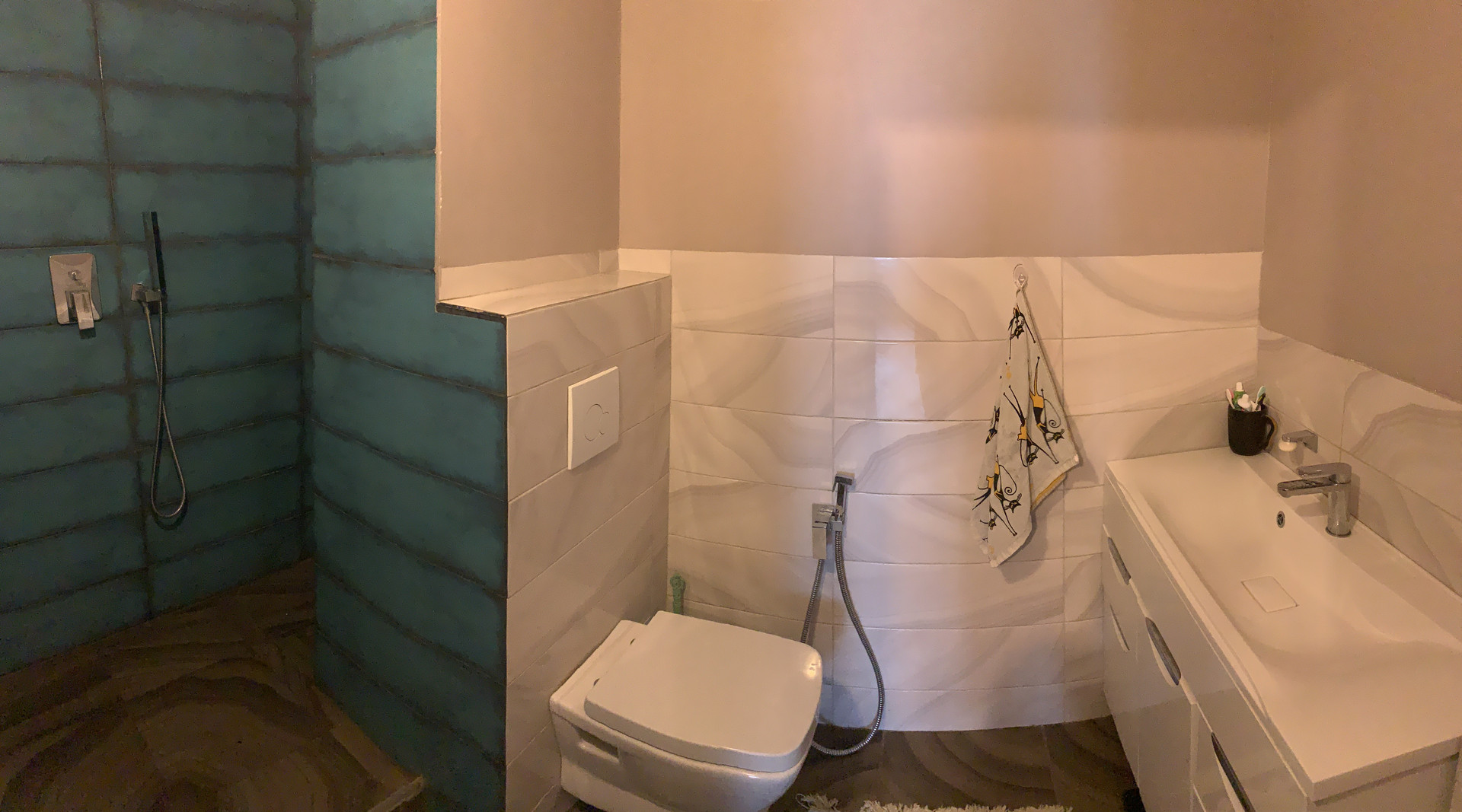 В ванной комнате смонтирован тёплый пол, произведена замена водоснабжения и водоотведения. Установлен тропический душ, подвесной унитаз (инсталляция), гигиенический душ;