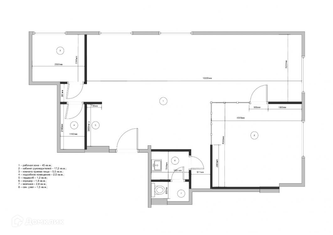 Офис состоит из двух кабинетов: кабинет директора 17 кв.м и общий кабинет 45 кв.м., также есть комната приема пищи, подсобное помещение и туалетная комната.
