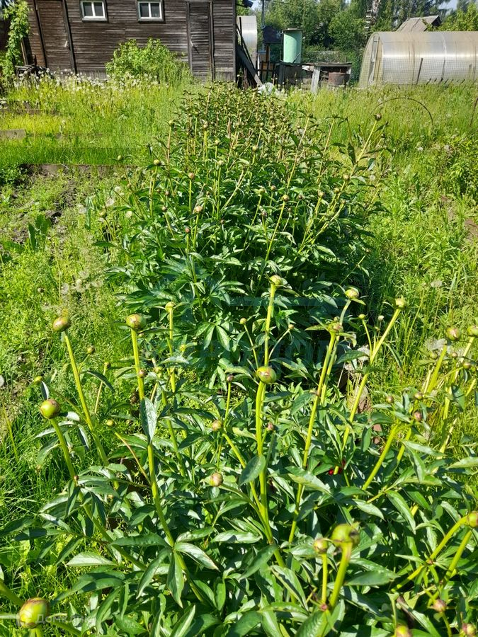Много цветов, садовые насаждения : смородина, малина, зелень на грядках.