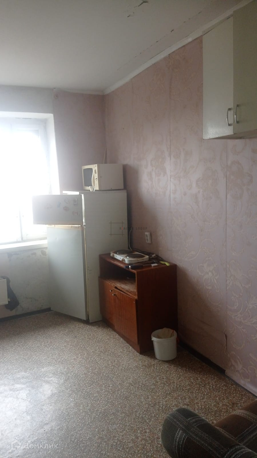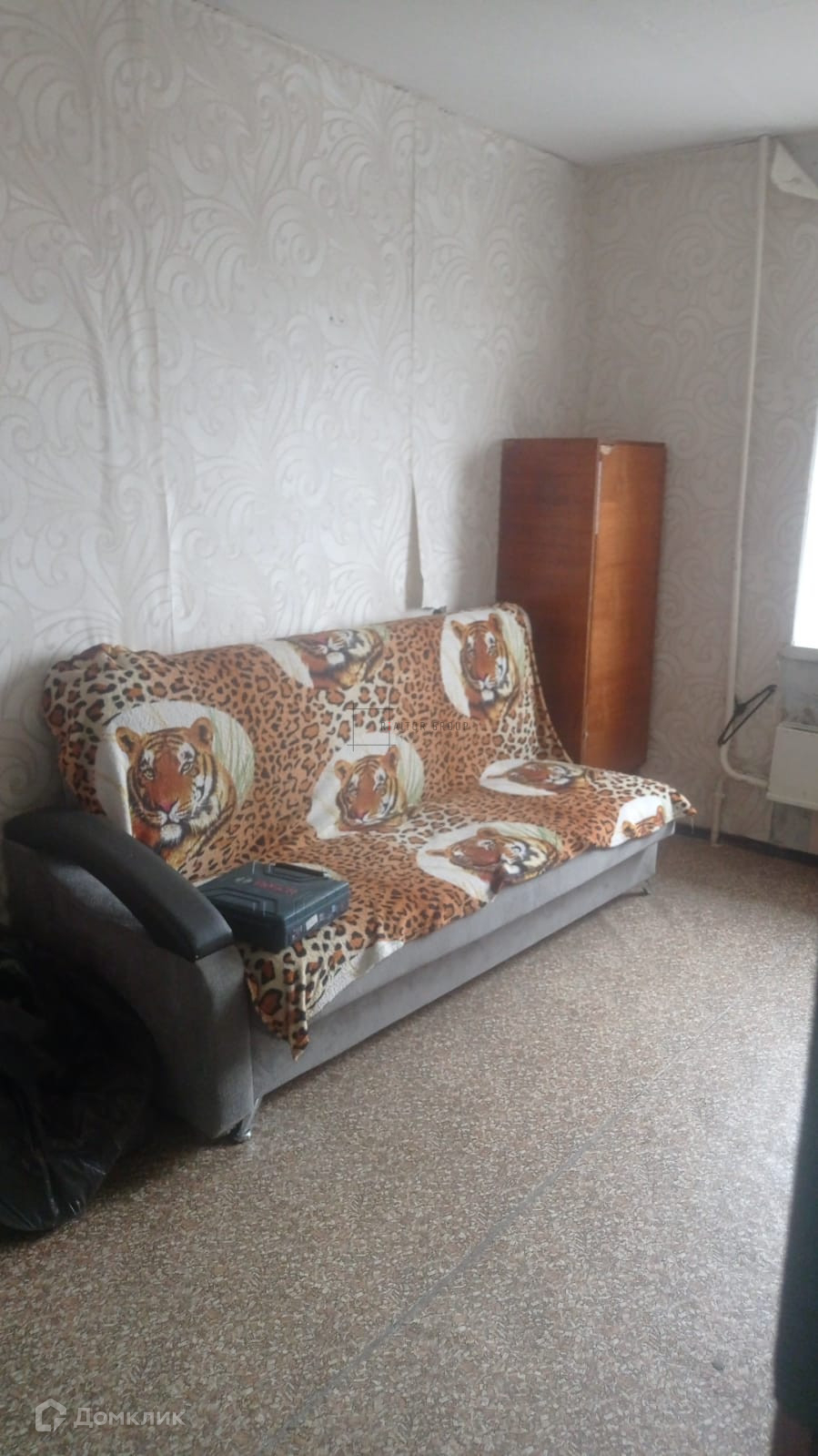 В  комнате, находятся - диван, шкаф, холодильник, плитка, микроволновка. Стиральной машины нет.