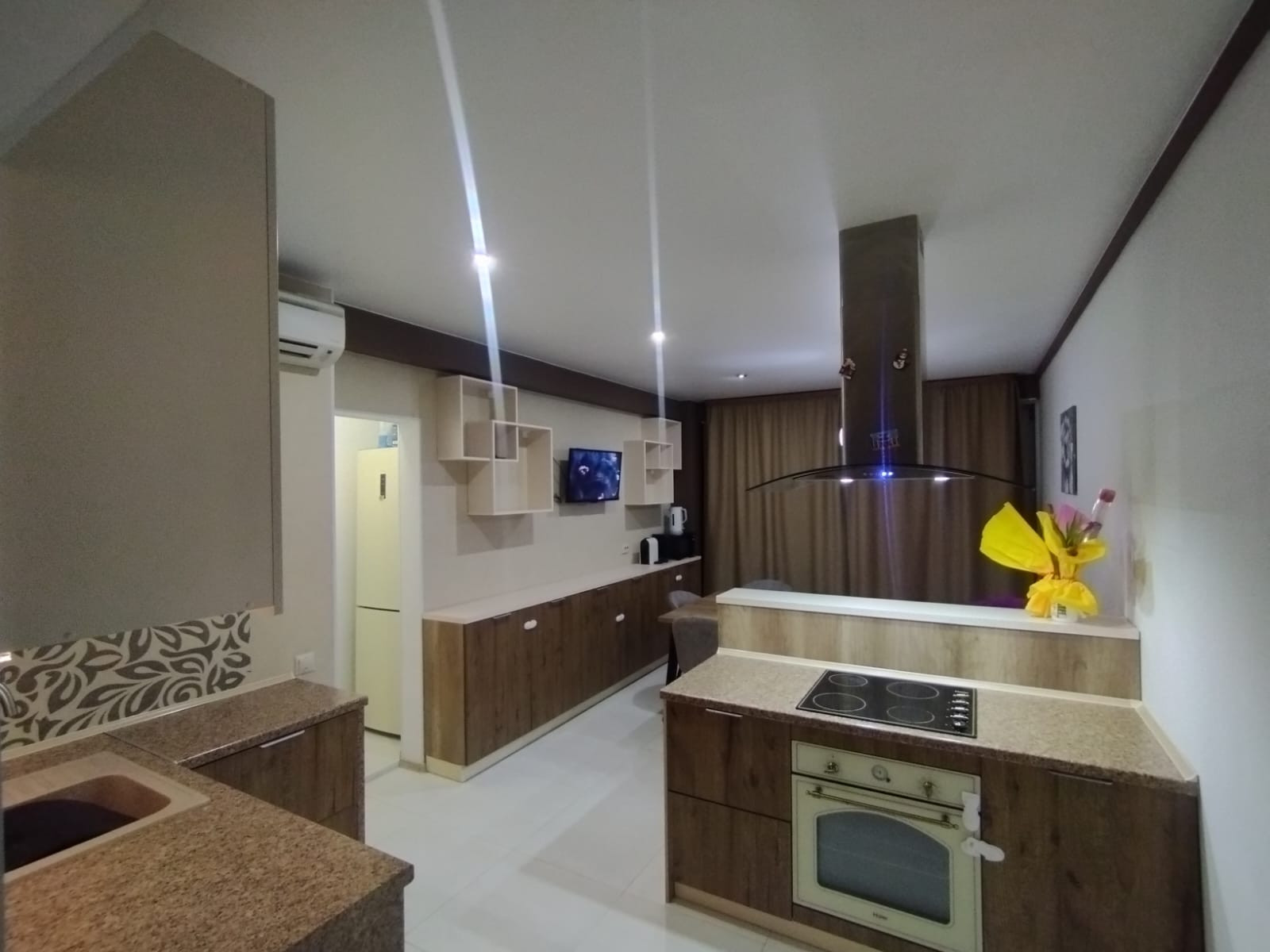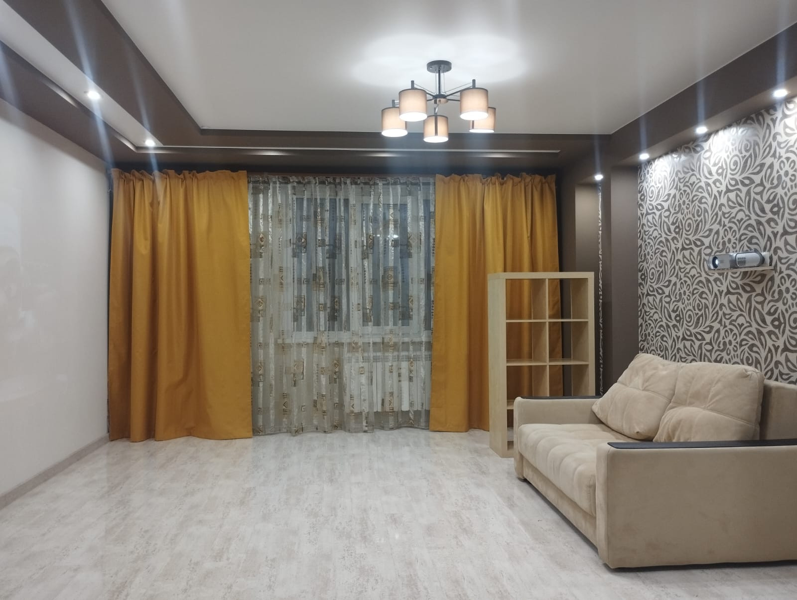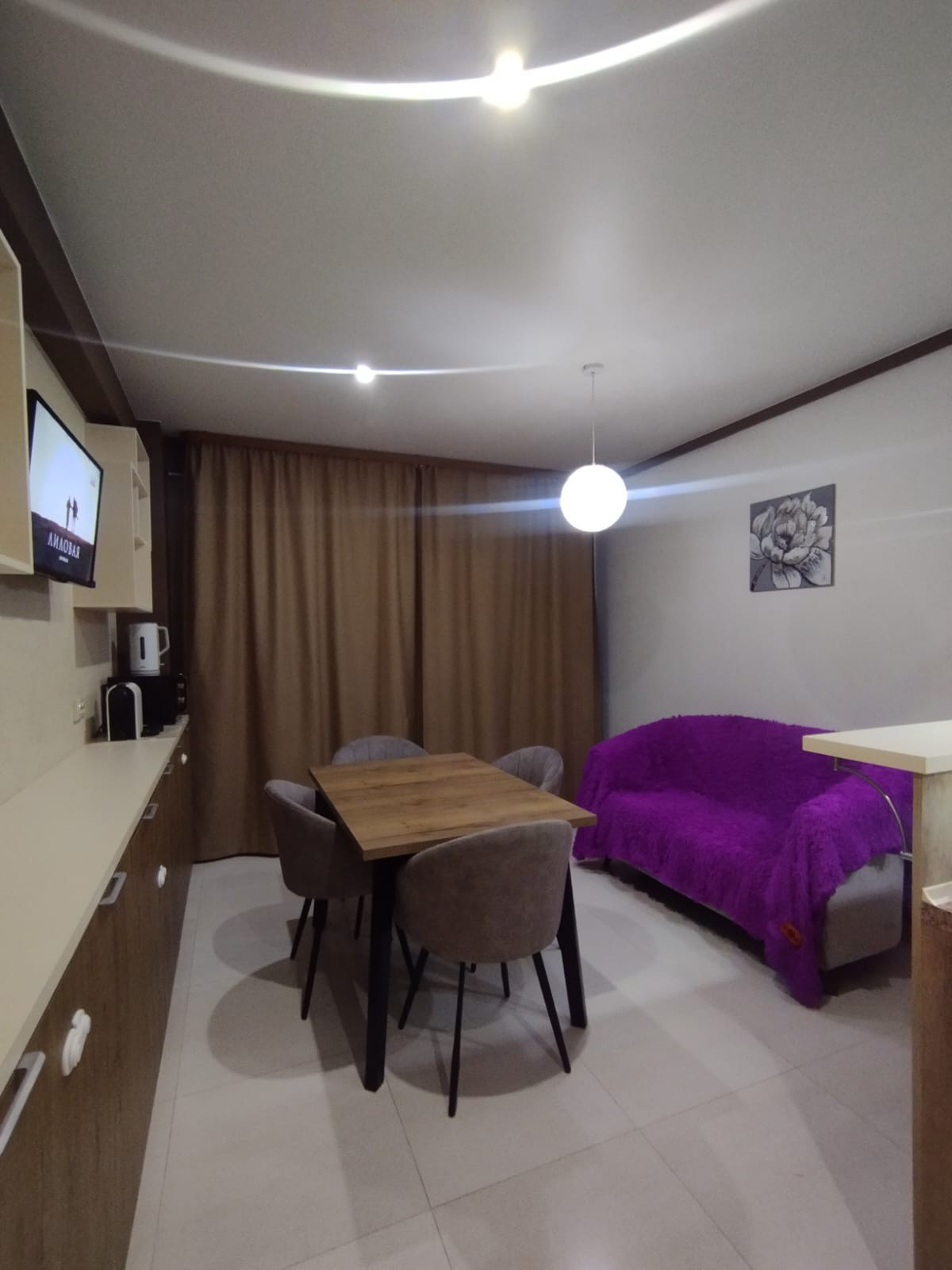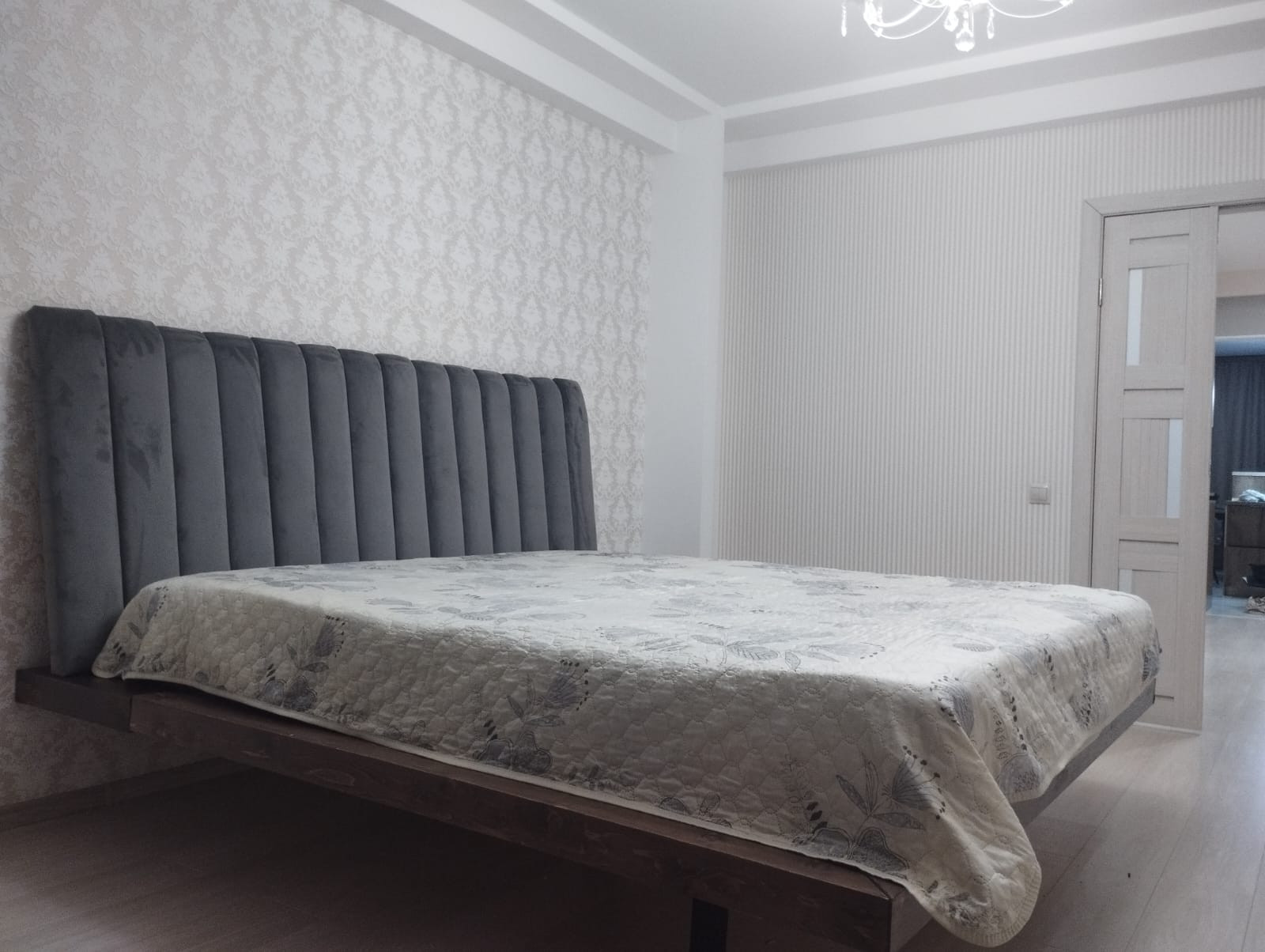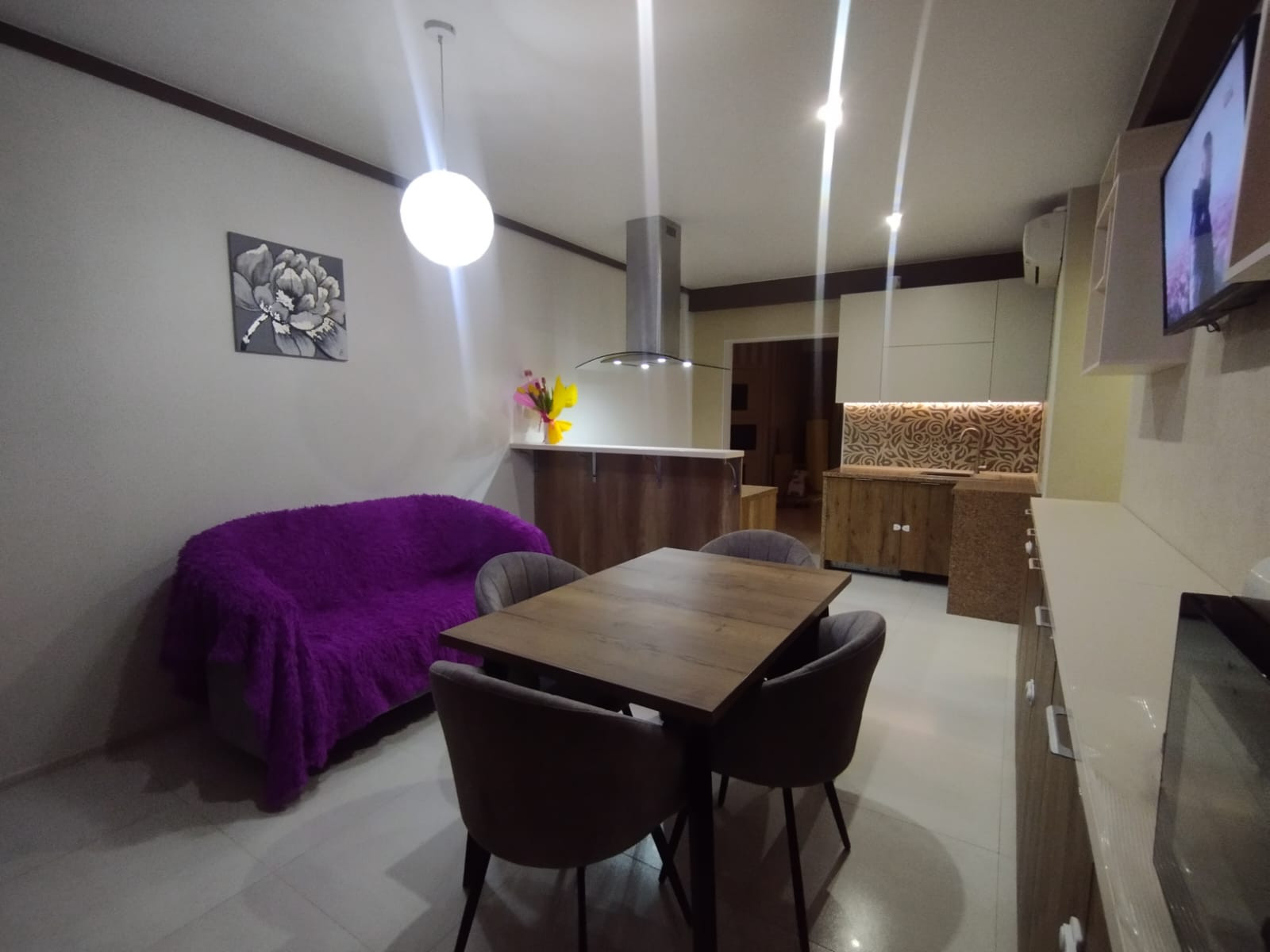 Планировка: кухня-гостиная, спальня, зал (большая комната) - можно сделать её под детскую или оставить как кинотеатр, коридор, санузел, 2 гардеробные. Окна выходят на обе стороны дома. В квартире есть всё необходимое для жизни (вся кухонная техника, постельные принадлежности, крупная/мелкая бытовая техника). Квартира очень светлая, уютная и тёплая.