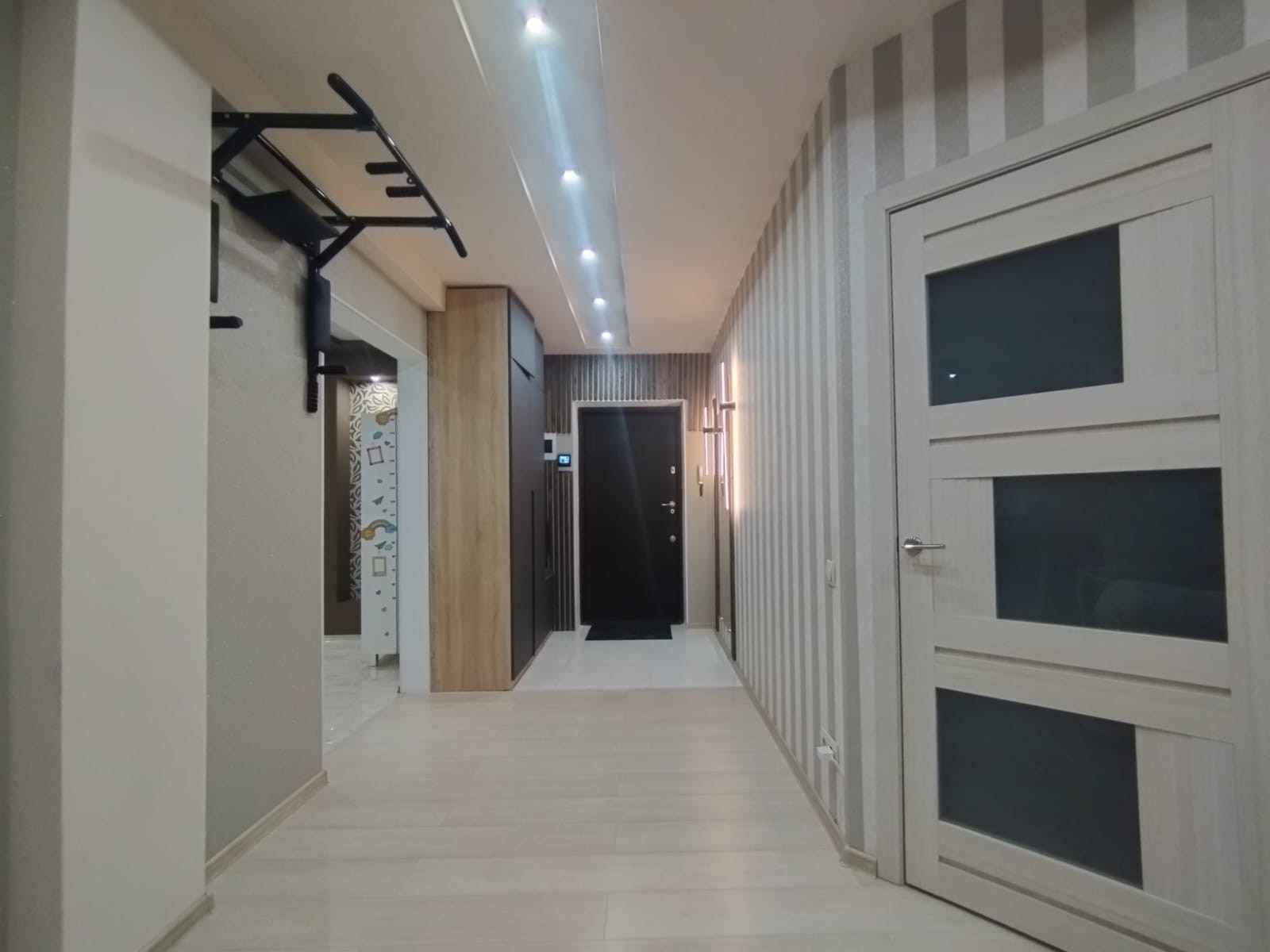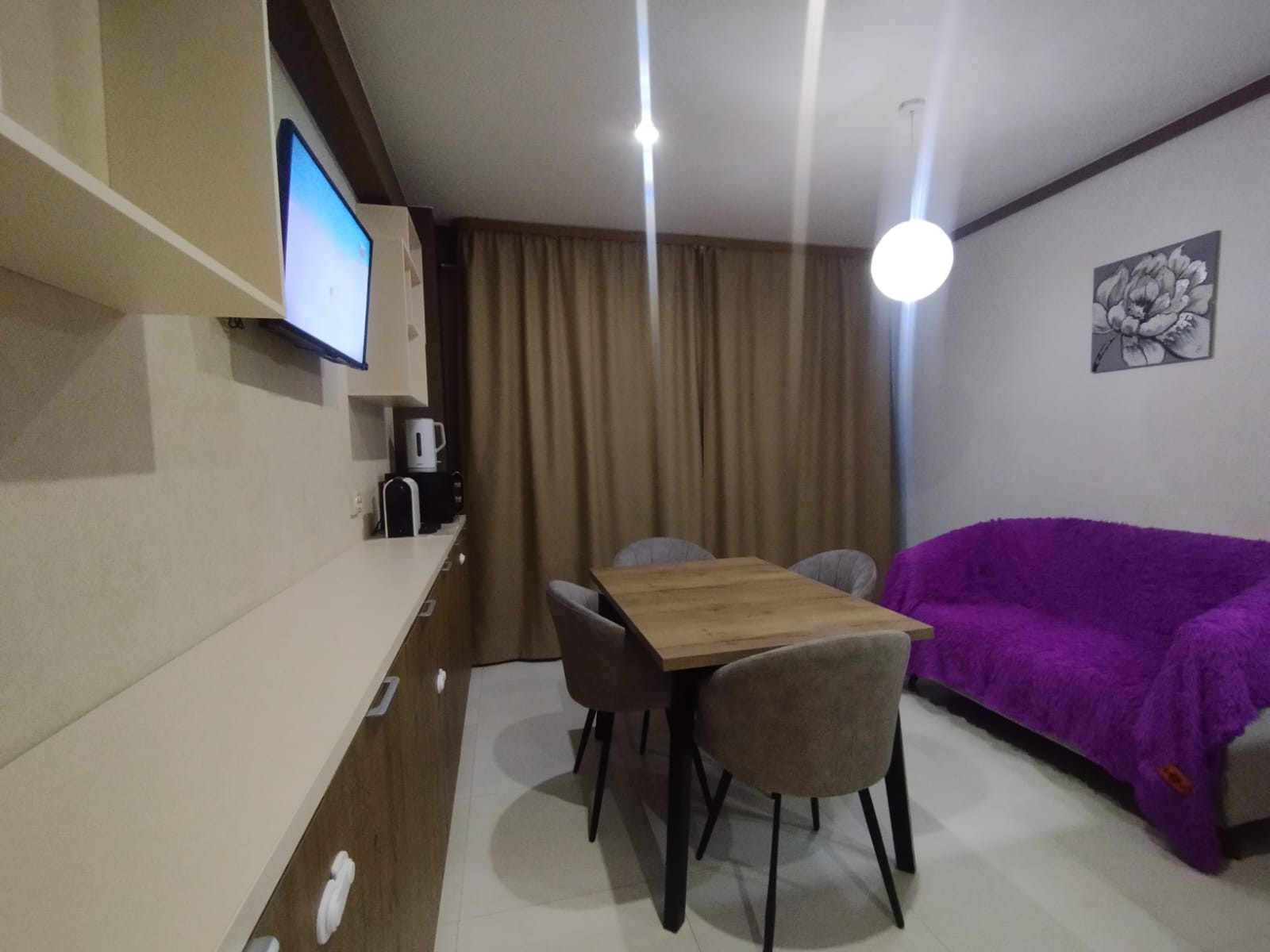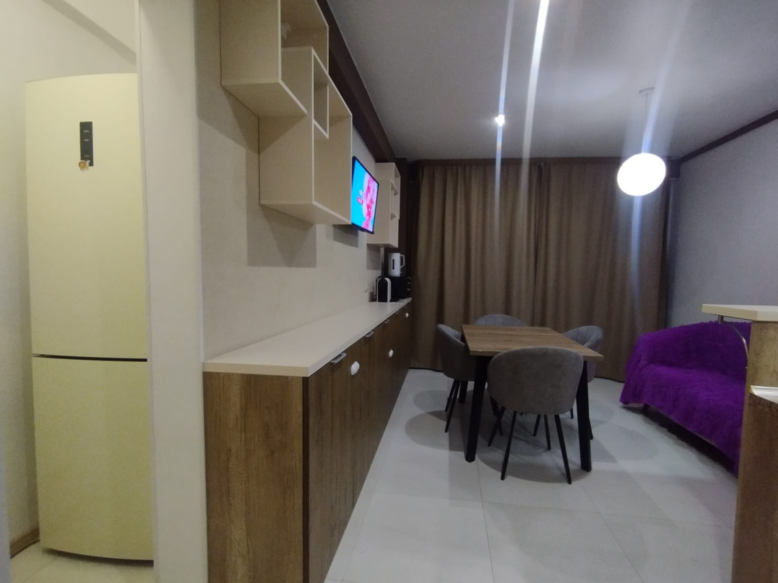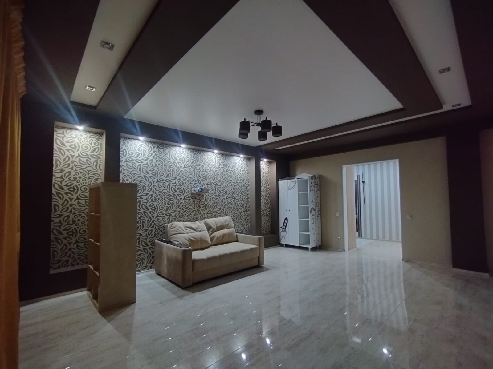 Планировка: кухня-гостиная, спальня, зал (большая комната) - можно сделать её под детскую или оставить как кинотеатр, коридор, санузел, 2 гардеробные. Окна выходят на обе стороны дома. В квартире есть всё необходимое для жизни (вся кухонная техника, постельные принадлежности, крупная/мелкая бытовая техника). Квартира очень светлая, уютная и тёплая.