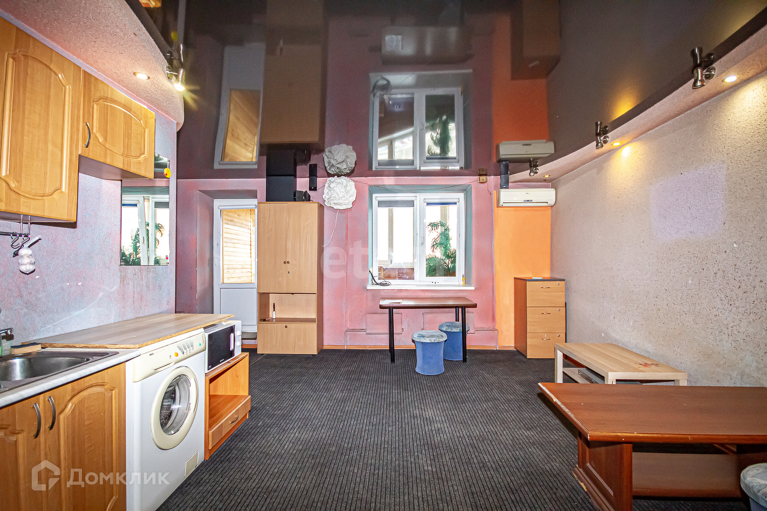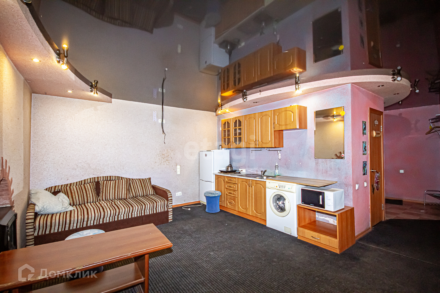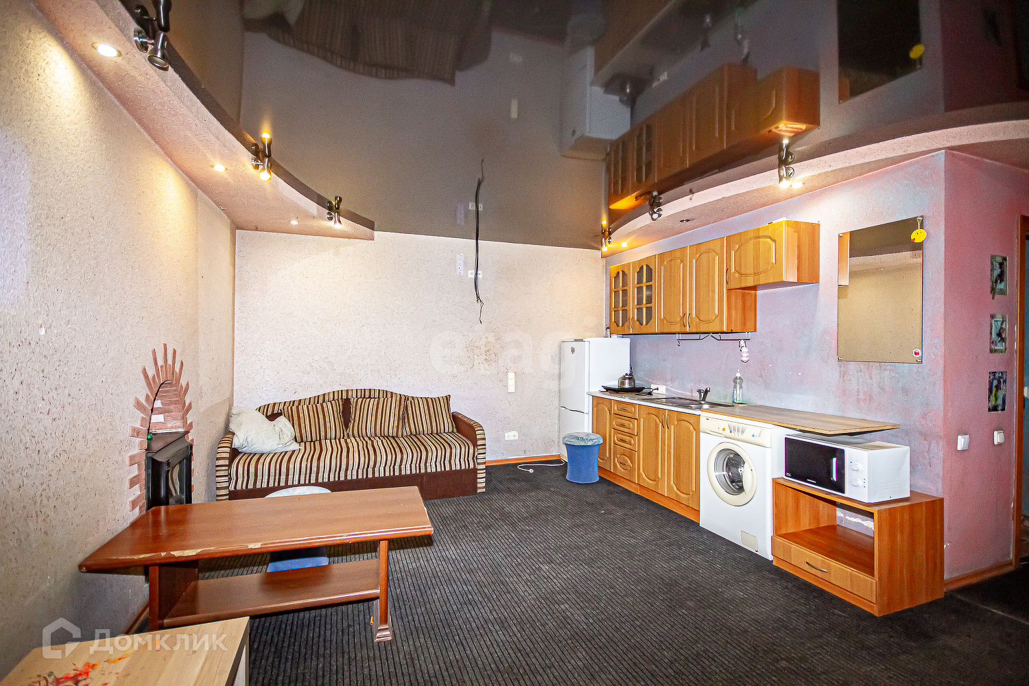 Сдаётся просторная квартира студия 40 метров квадратных. Квартира необычная, в квартире есть настоящая просторная сауна, просторный тёплый балкон подойдёт для зоны отдыха после сауны, он широкий и просторный, как комната. Этот балкон очень необычен для квартир. Из мебели и техники есть всё необходимое для вашего проживания. Из мебели есть: шкаф, диван, кухонный гарнитур, диван скамья из натурального дерева, кухонный стол, два журнальных стола, пять штук мягких пуфов, два журнальных стола, два кресла для отдыха из натурального дерева, оборудована прихожая зона. Из техники есть: холодильник, индукционная плита стиральная машина автомат, музыкальный центр. В квартире есть электрический камин и сейф.