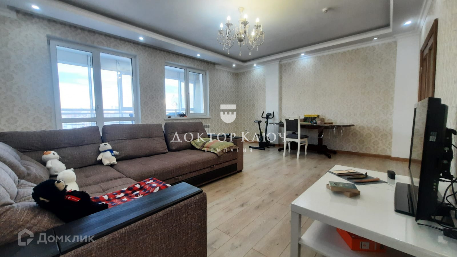 Гостиная: стол деревянный на 6 персон, диван большой угловой раскладываемый, книжный столик, телевизор, ТВ-приставка. Люстра + светодиоды + RGB-подсветка