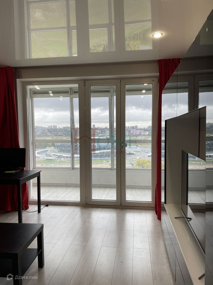 Отличный панорамный вид из окон на Ледовую арену, сноуборд трассу, озеро, правый берег.
