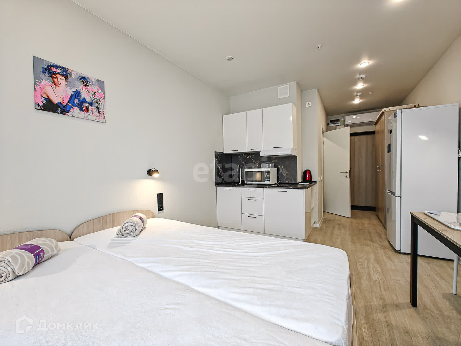 В квартире есть всё необходимое для комфортного проживания. Выполнен евроремонт, установлена современная мебель и техника: кондиционер, холодильник, телевизор, стиральная машина, микроволновая печь, электрический чайник. Ванная комната оснащена душевой кабиной.