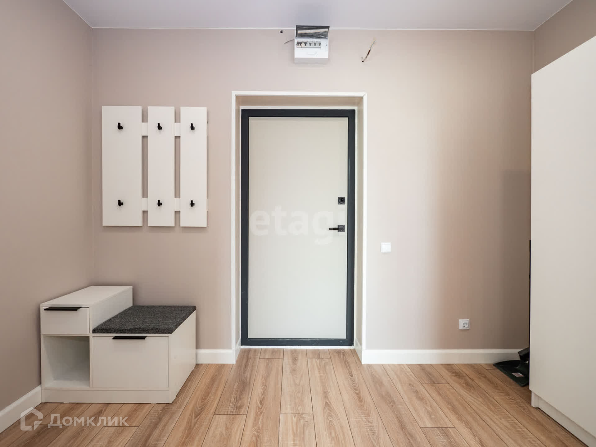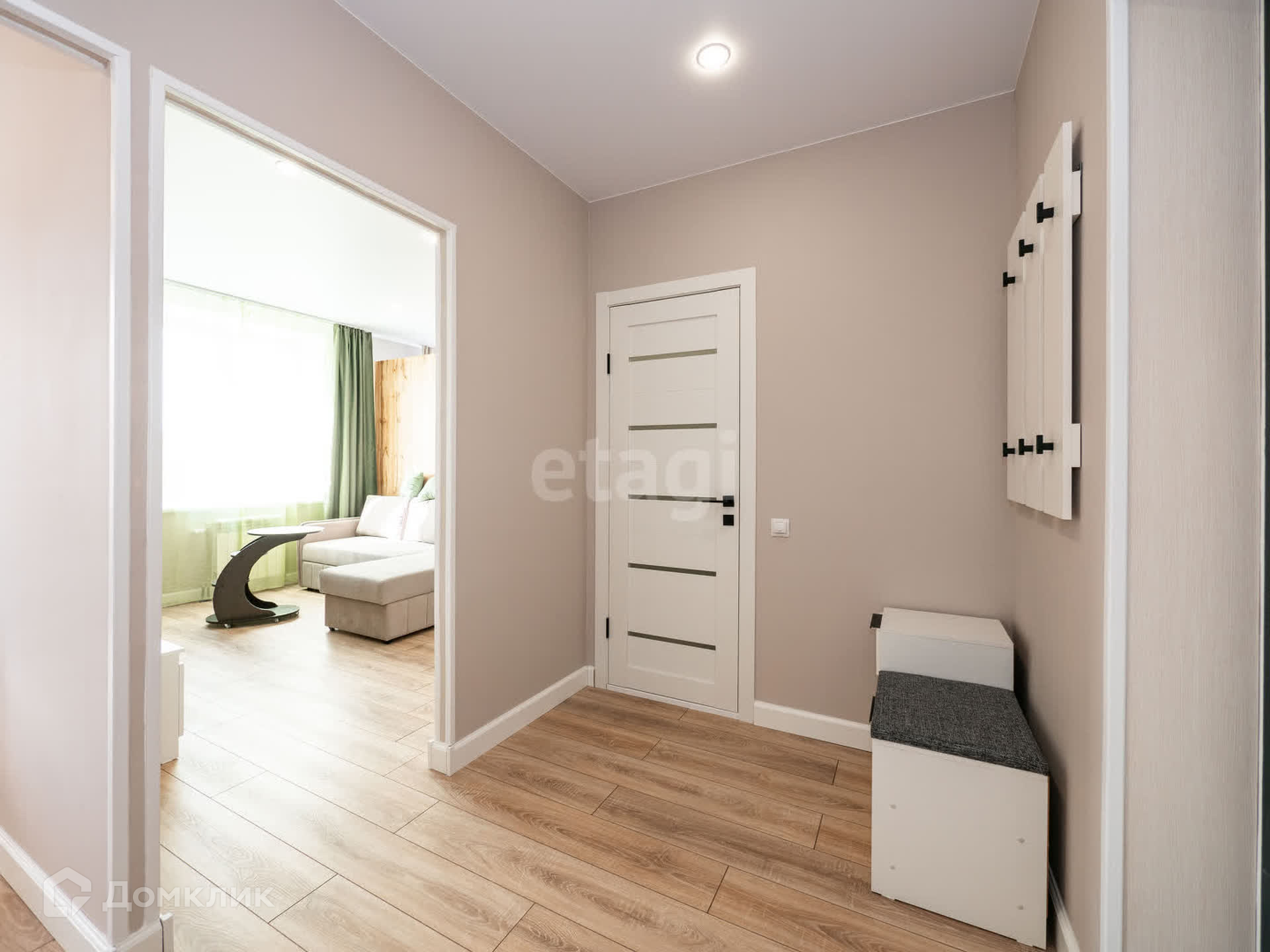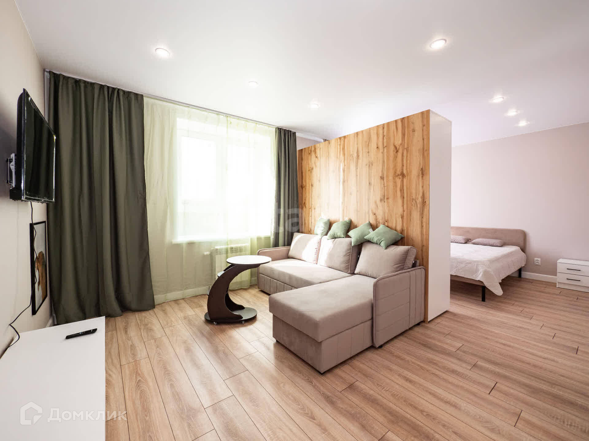 Имеется диван, телевизор, журнальный столик, кровать, шкафы для хранения одежды.