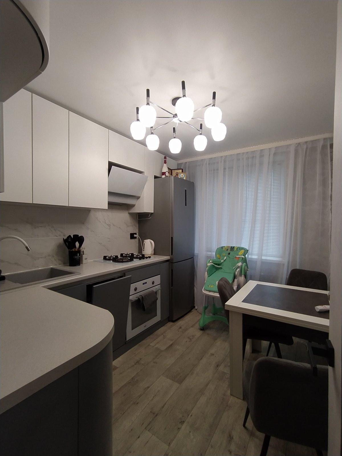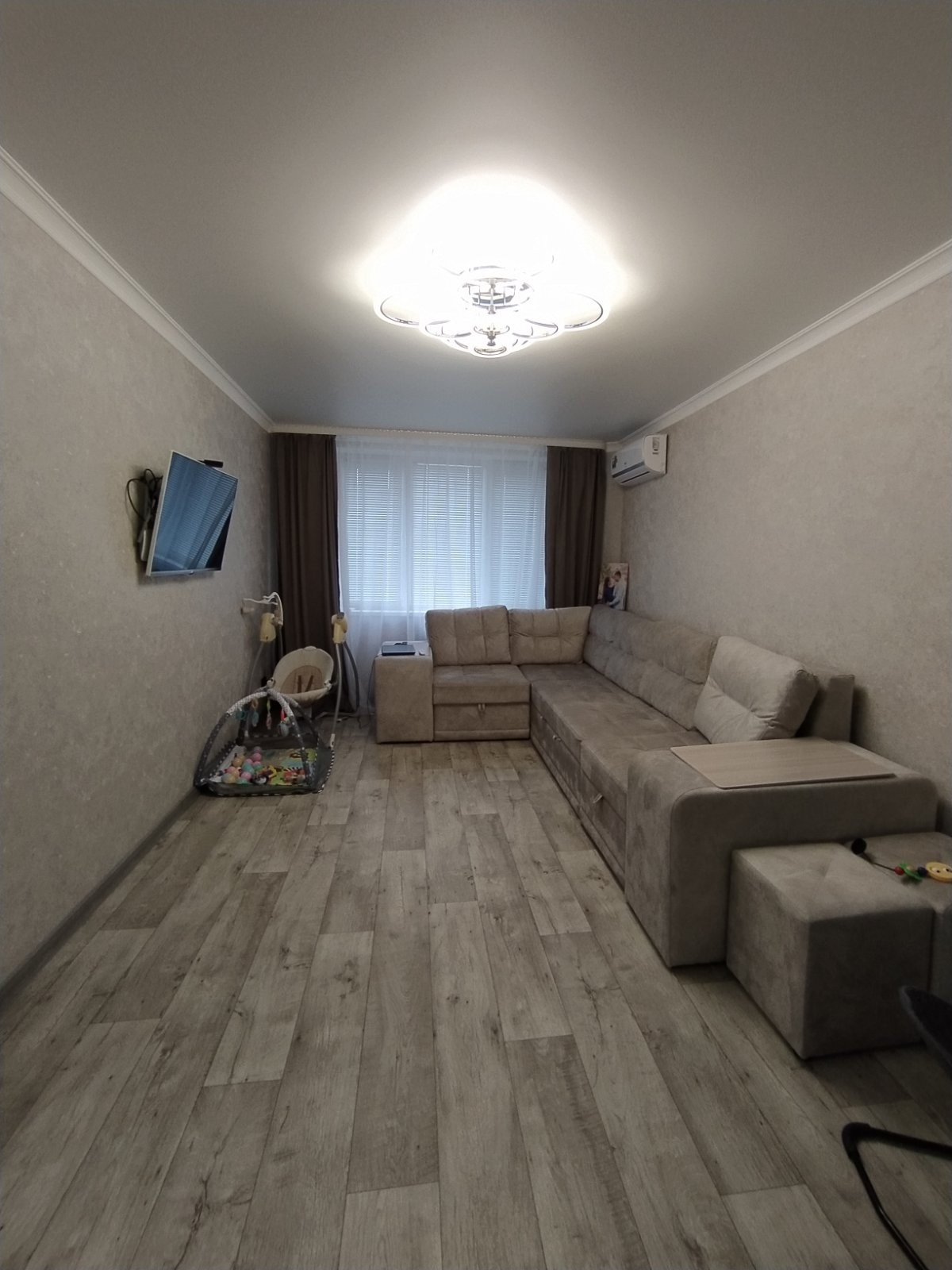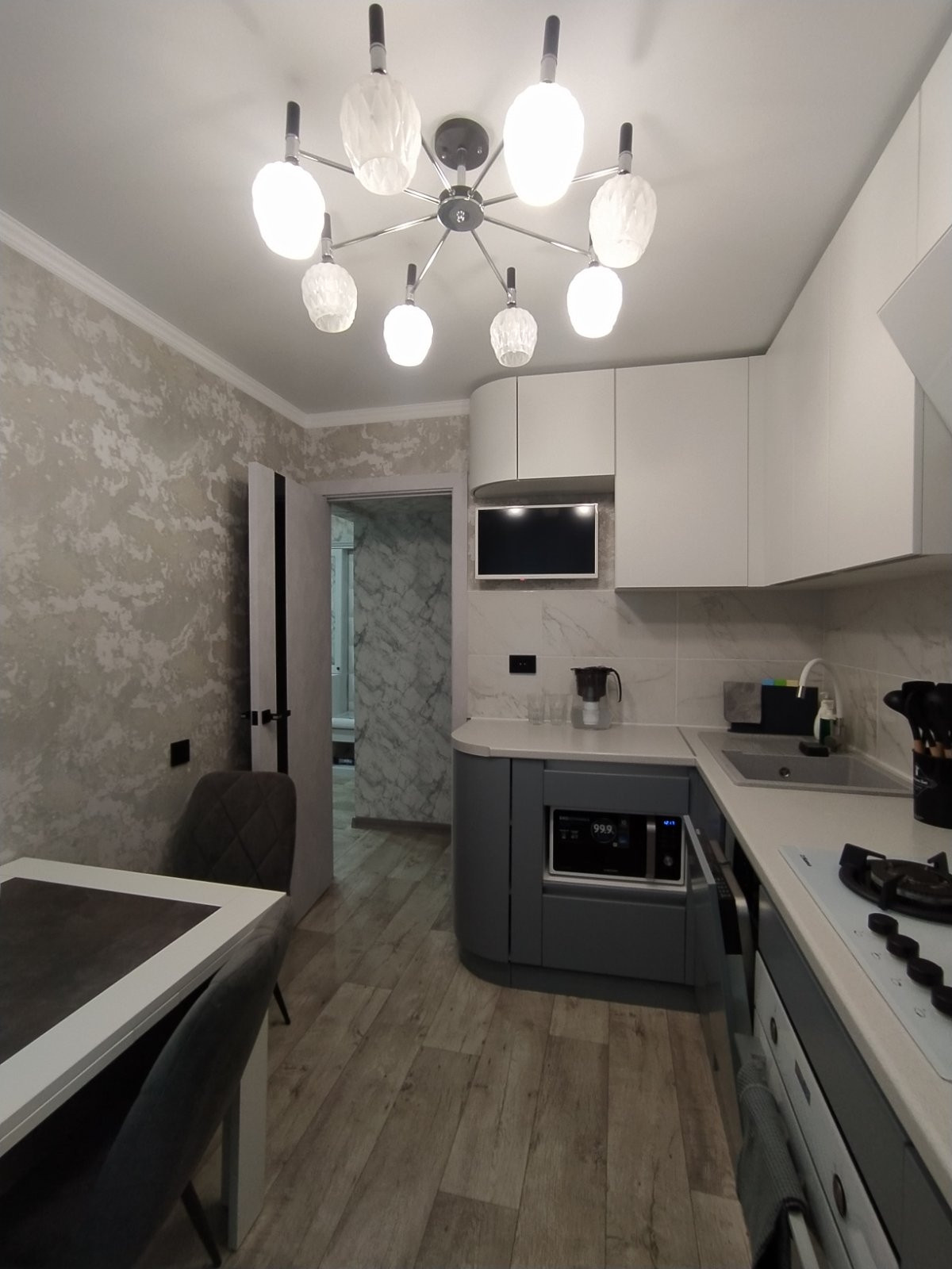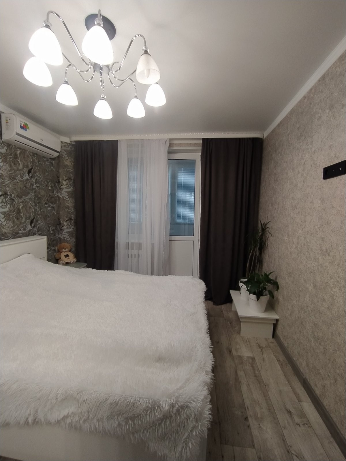 В квартире выполнен свежий, качественный, из дорогих материалов, ремонт, в августе этого года. Проводка заменена на медную, стены выровнены, идеально оклеены обоями, в сетлых, спокойных тонах. Батареи заменены -на новые чугунные, с кранами. Имеется водонагреватель. Потолки натяжные, балкон - евроотделка, большой, как отдельная комната.В квартире приятная атмосфера, пахнет новым ремонтом и мебелью, которую недавно приобрели и оставляют в подарок новым владельцам. Так же остаётся вся бытовая техника, кроме телевизора, Всё на гарантии! Новый кухонный гарнитур с посудомойкой, варочной панелью, духовым шкафом. Виды из окон - во двор, с другой стороны на Аллею славы! Общий коридор тоже с ремонтом!