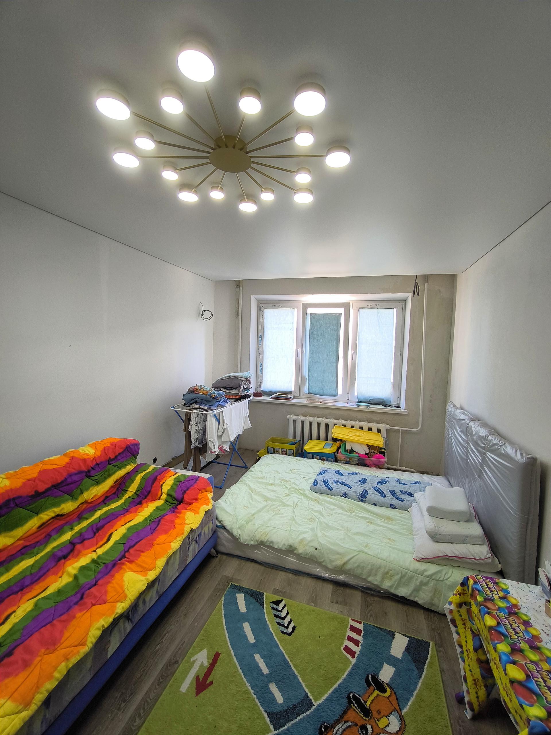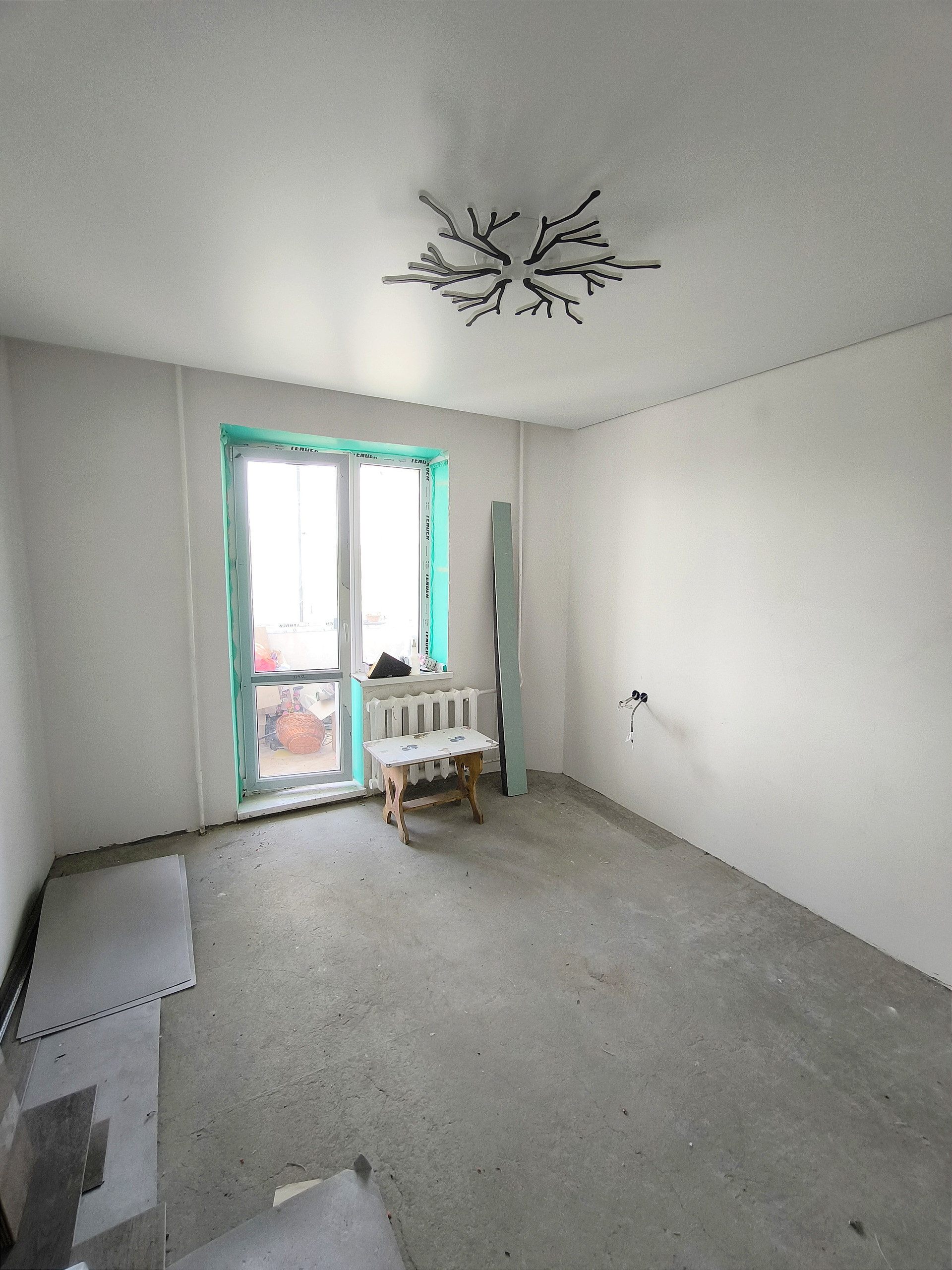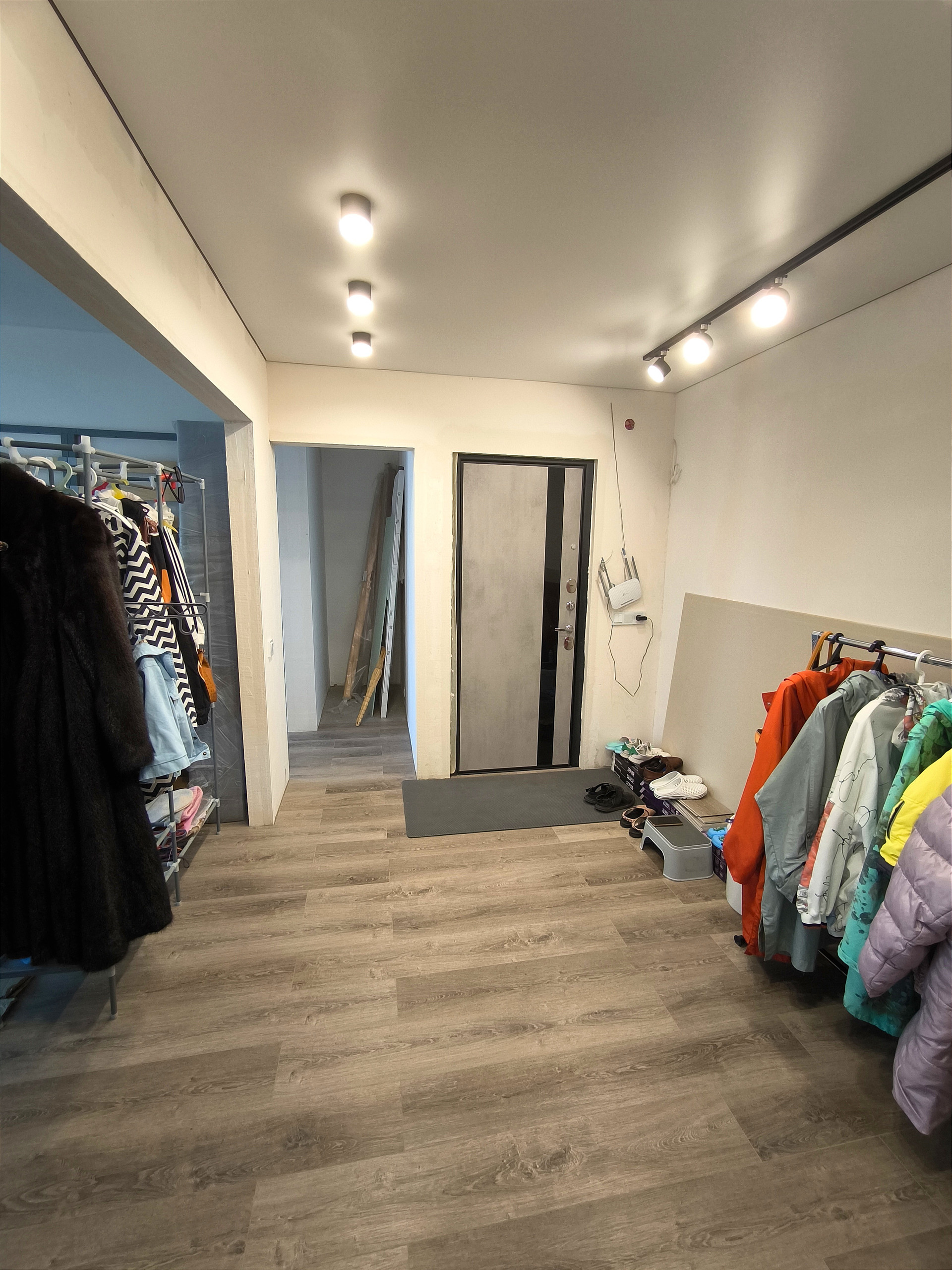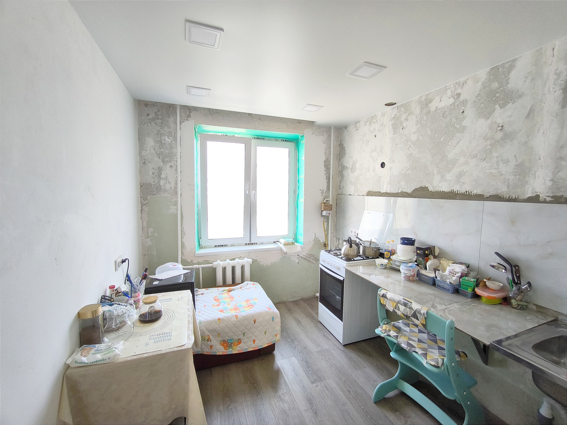 Выполнена бетонная стяжка во всей квартире, далее настелено кварц-виниловое покрытие. Стены отшпаклеваны, натяжные потолки во всей квартире.