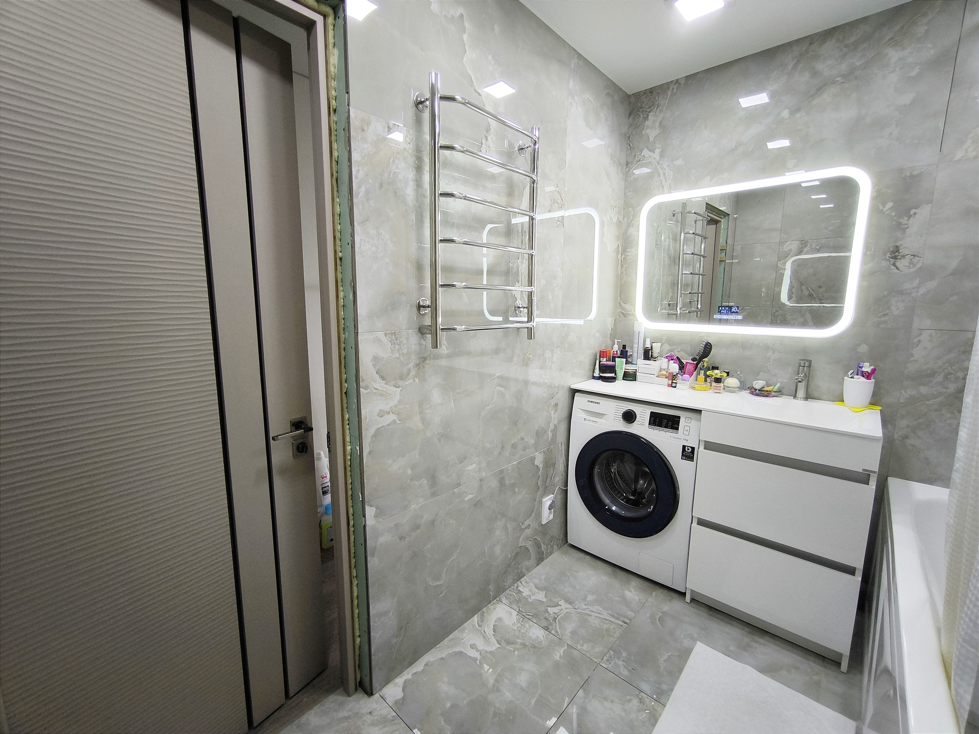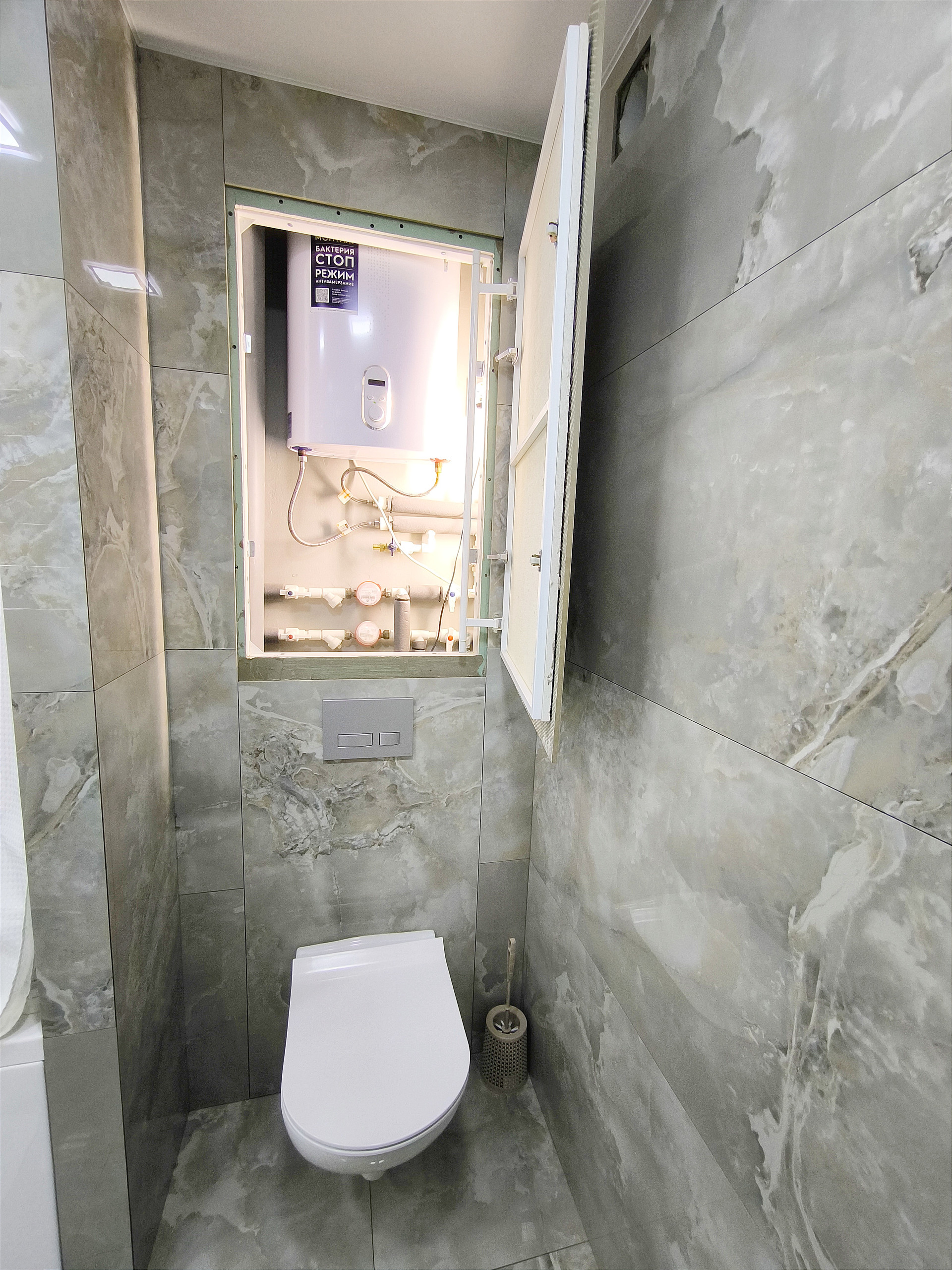 Санузел объединён и облицован широкоформатным керамогранитом. Вся сантехника и коммуникации новые. В скрытой нише "спрятан" эл/бойлер, который обеспечит вас горячей водой, в случае отключения.