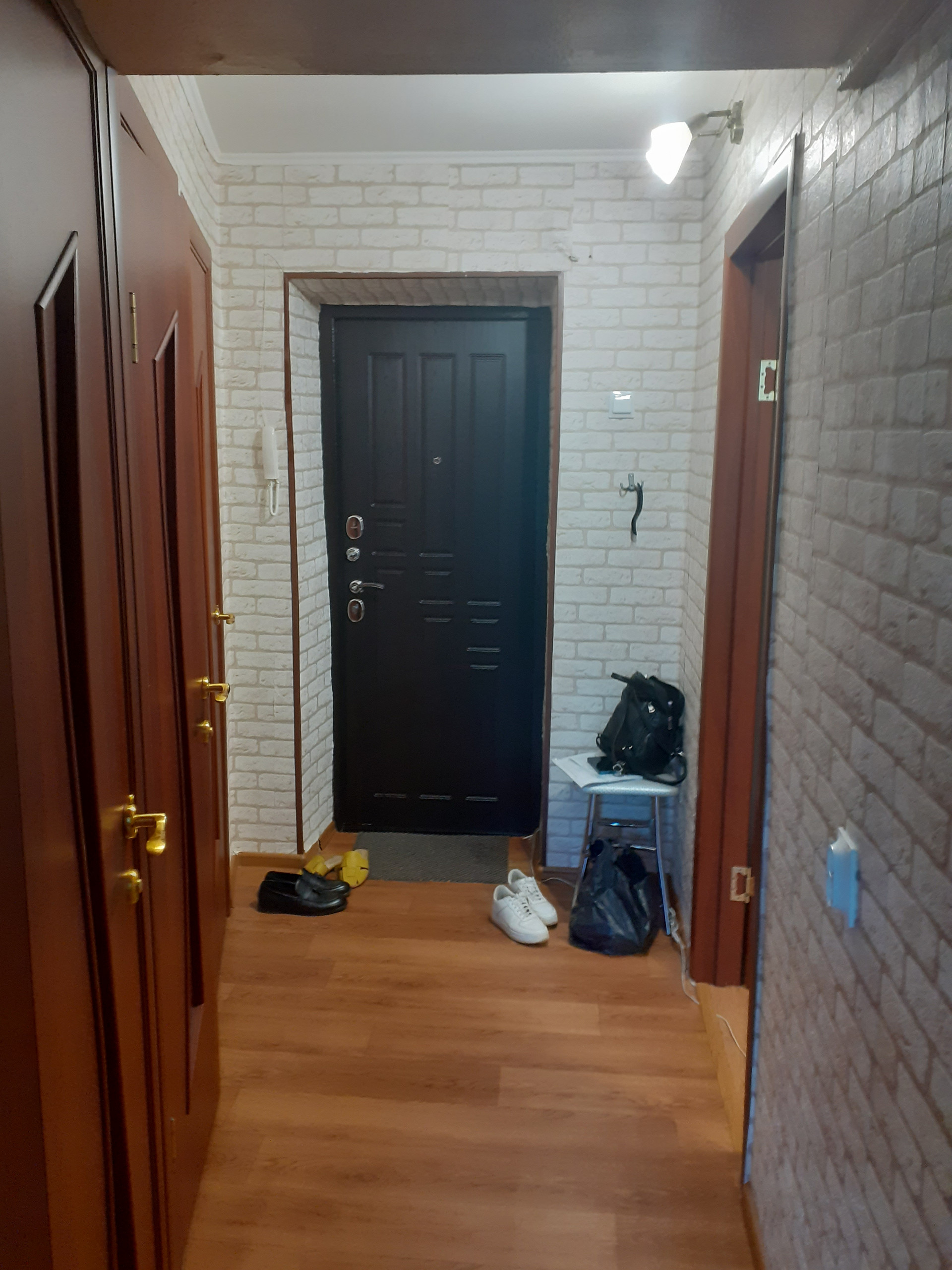 Квартира оборудована новой входной дверью и межкомнатными дверями. В гардеробной предусмотрено место для раздевалки и удобного хранения.