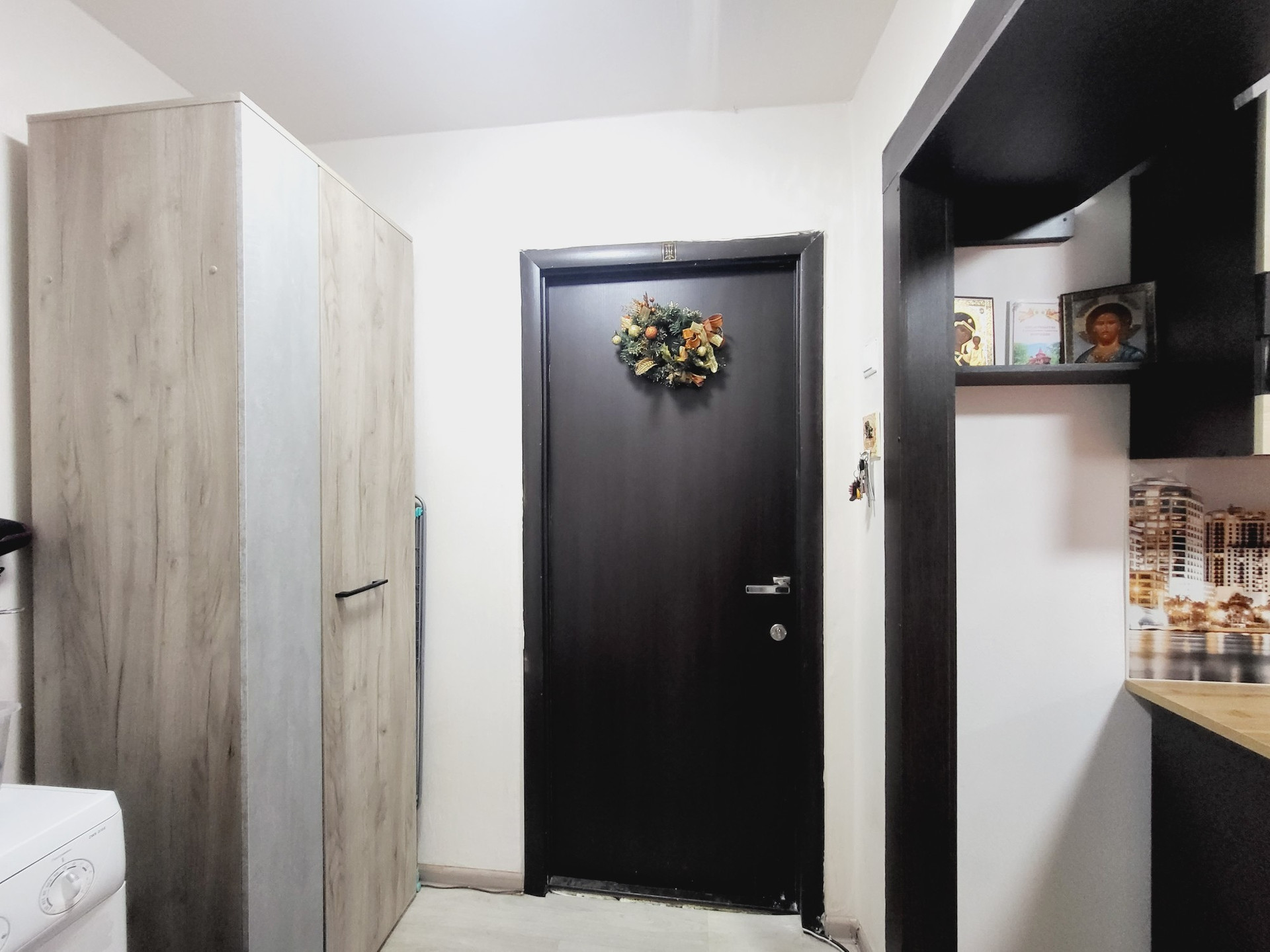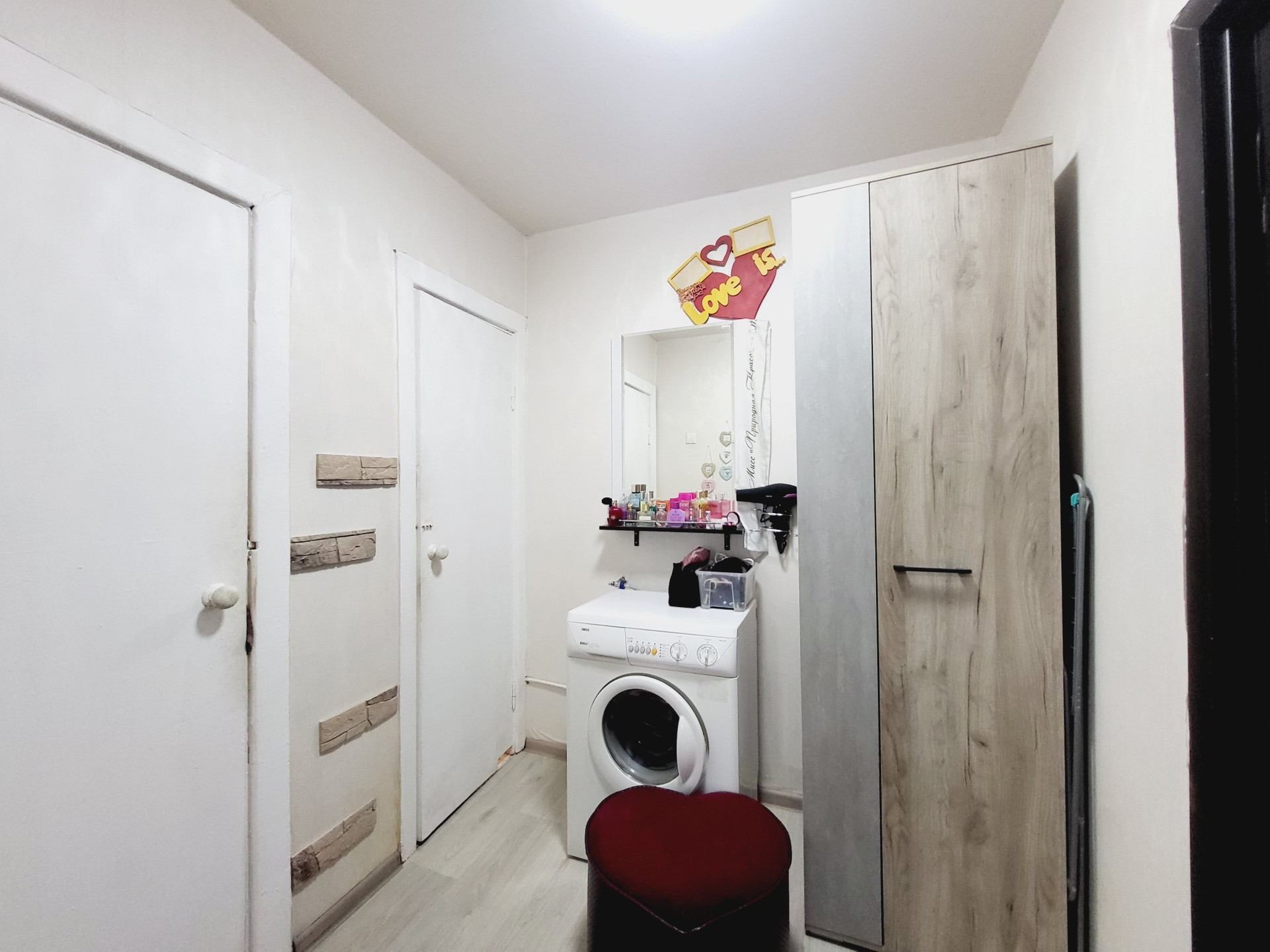 В отделке использованы качественные материалы, установлена красивая дверь, есть вместительный шкаф-гардеробная с антресолями.