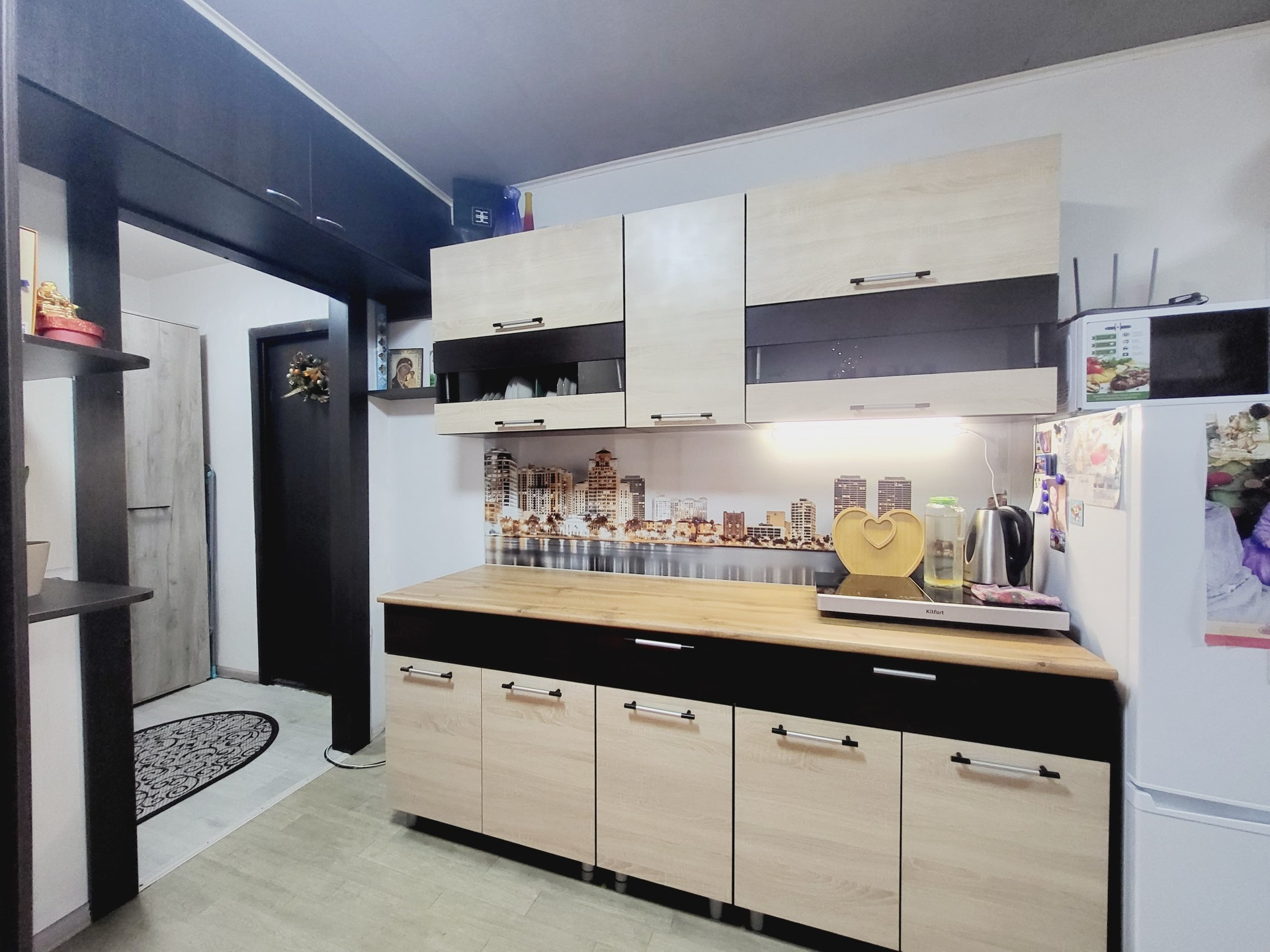 Красивый  кухонный гарнитур отлично вписался в обстановку. Создает атмосферу уюта.