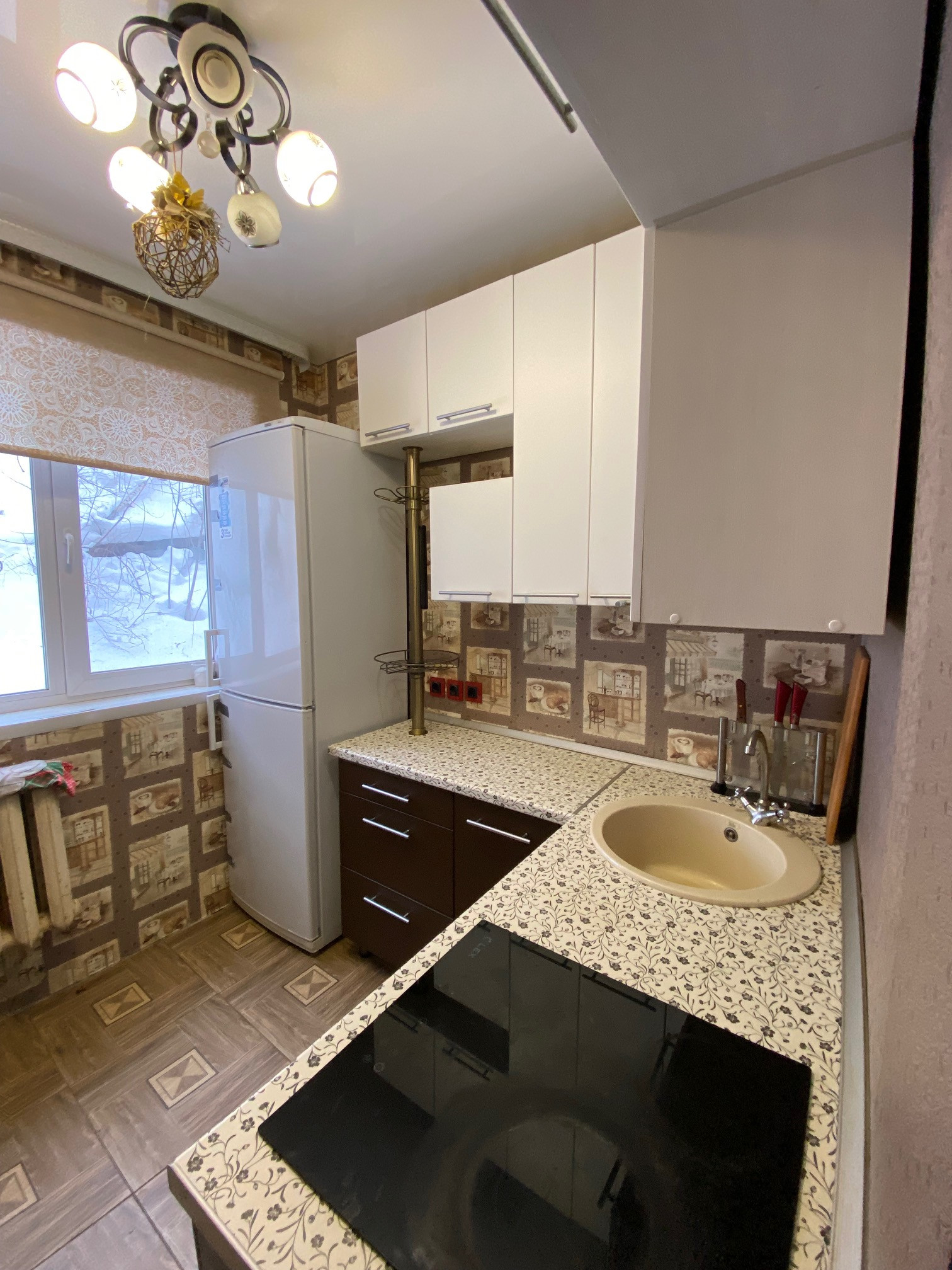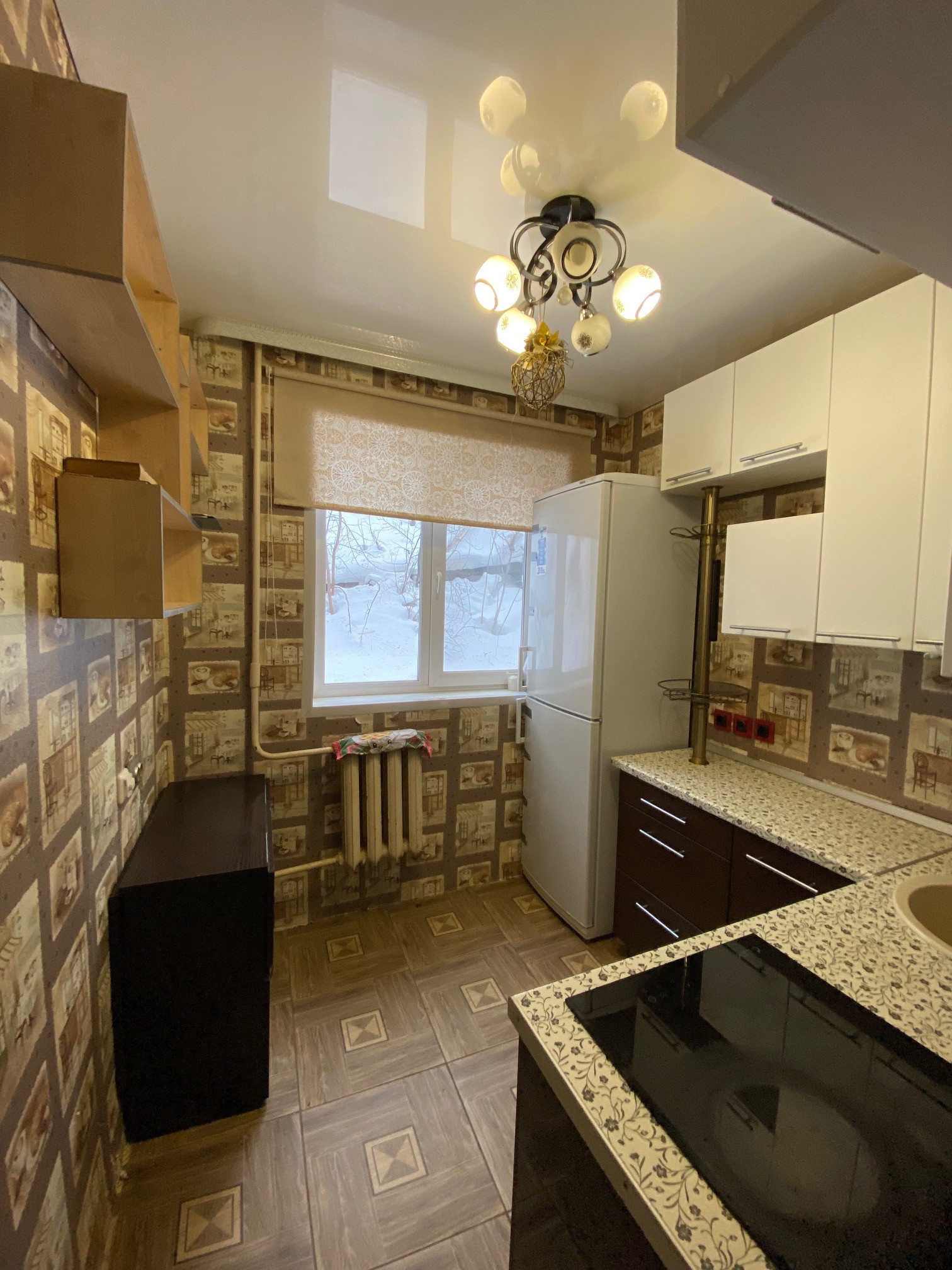 В квартире установлены пластиковые стеклопакеты, на полу на кухне теплый пол с керамогранитом и натяжной потолок, в комнате ковровое покрытие, в коридоре линолеум. Качественная сейф-дверь.