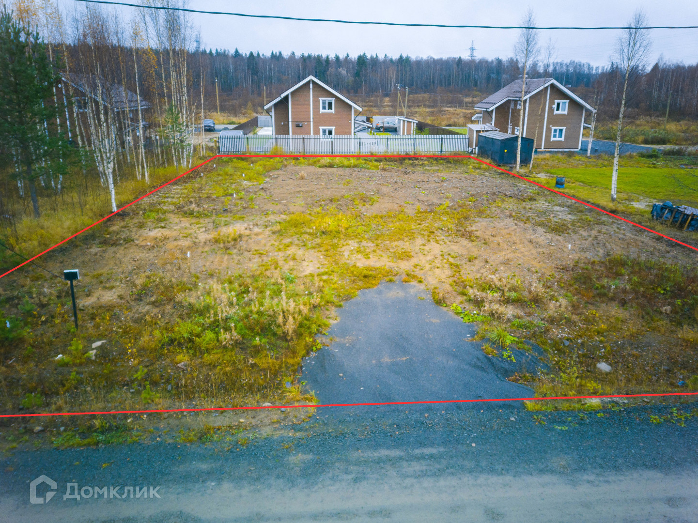 Вырублен лес, удалены пни, частично отсыпан пгс. Сделан дренаж.