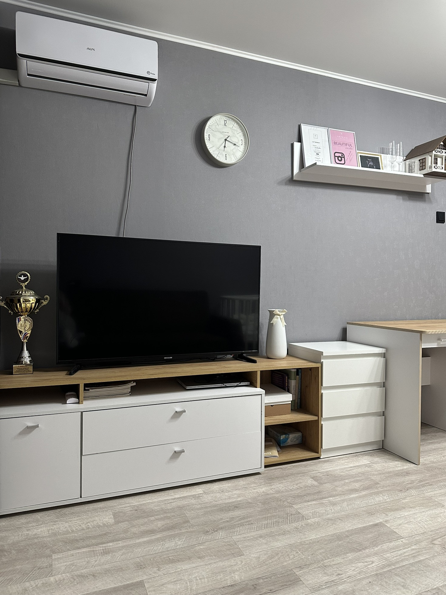 Оставляем кухню с духовкой, варочную панель, вытяжку. В комнате останется огромный вместительный шкаф-купе, новый кондиционер(можно выставлять на холод и тепло). В ванной останется водонагреватель на 50 л, тоже новый, установили этим летом. Остальная мебель по договоренности.