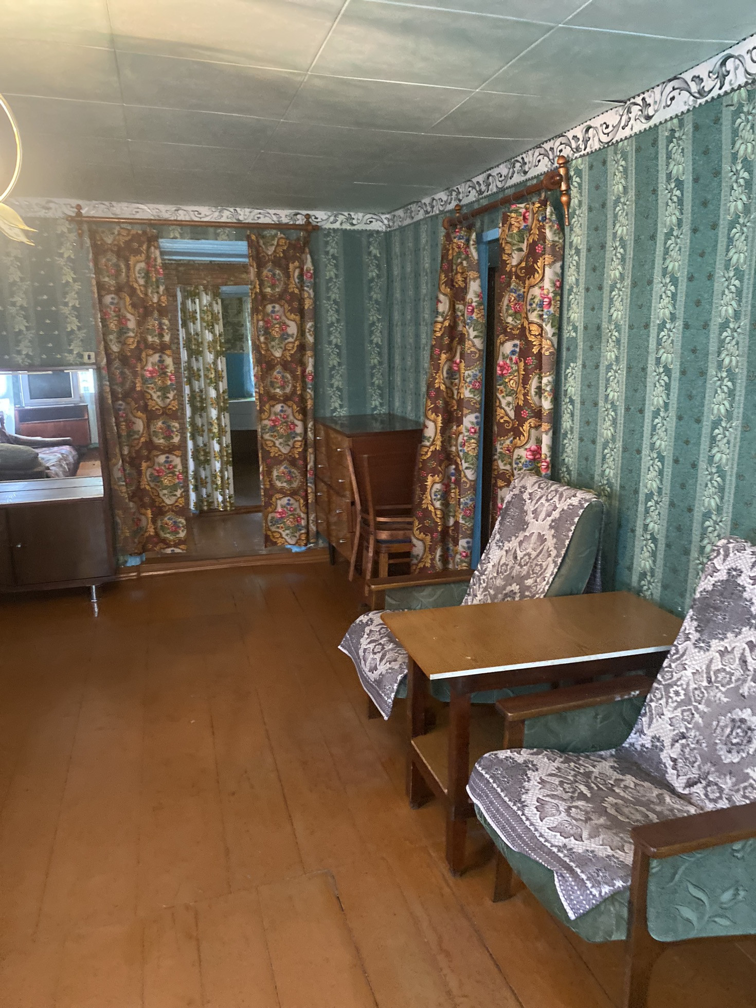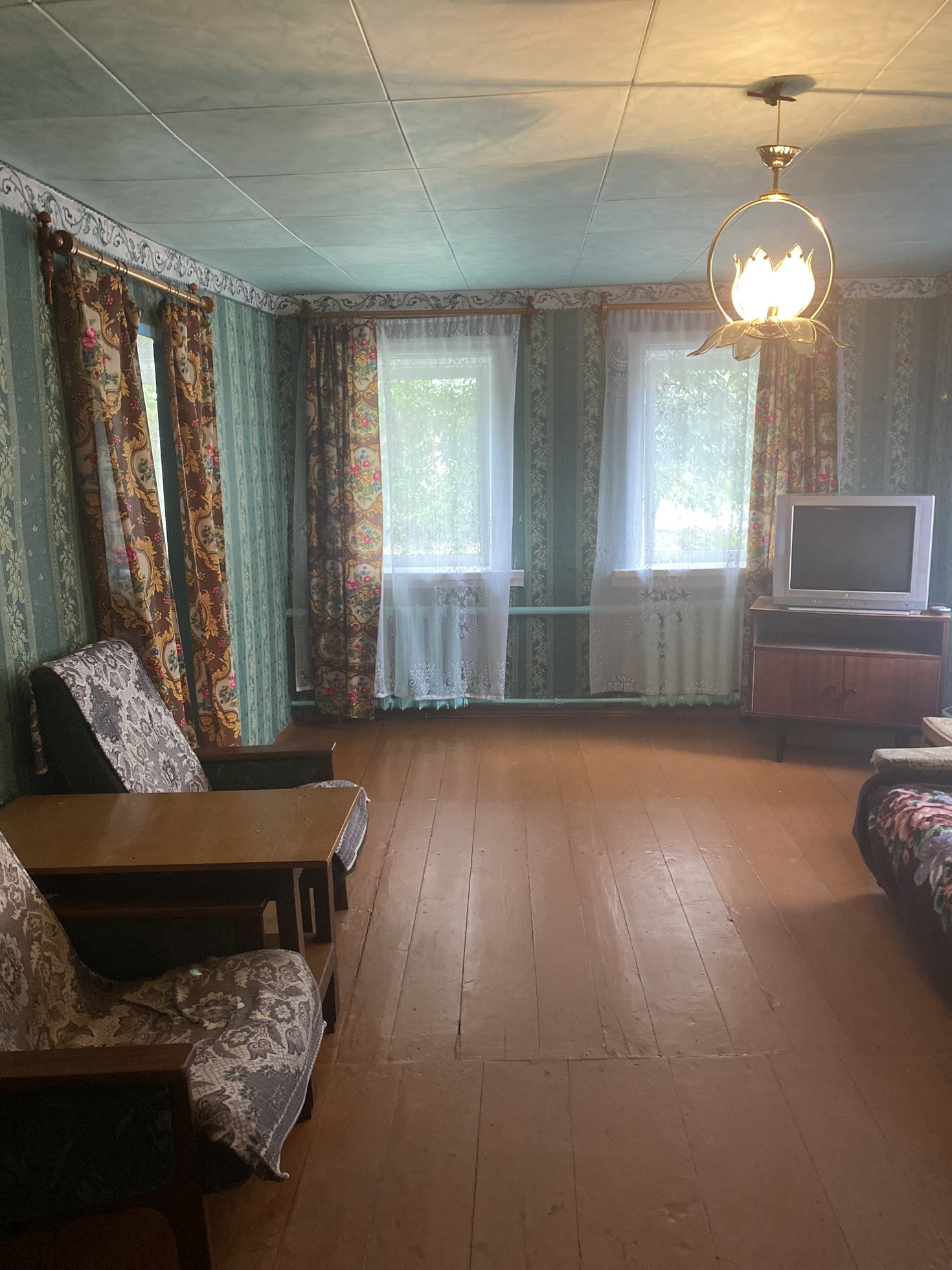 Дом деревянный , обшитый с наружи пластиком. Есть газ , вода , удобства во дворе. На территории есть гараж, баня, летняя кухня и сарай.