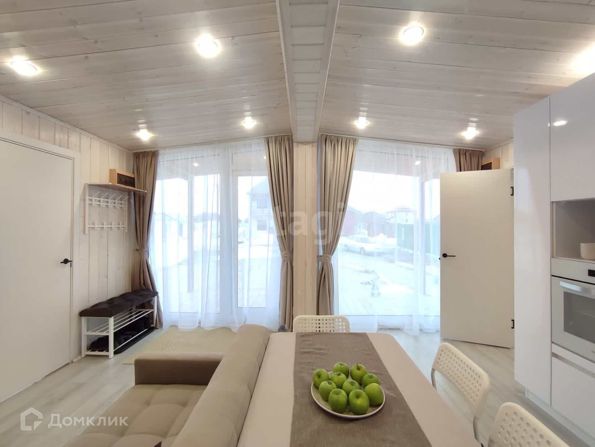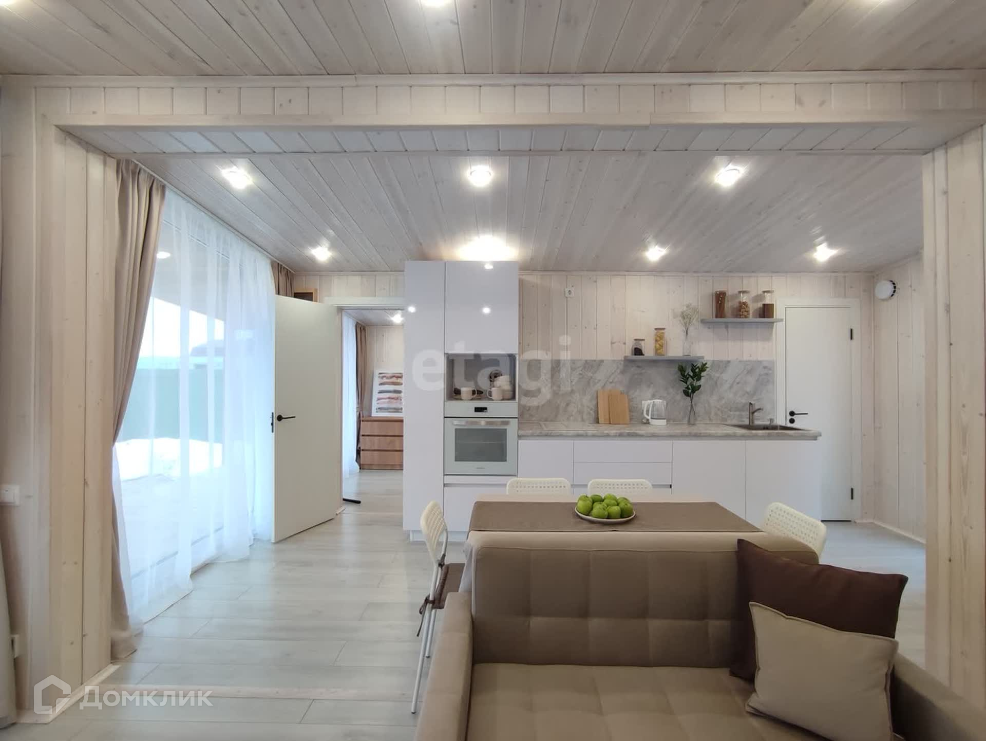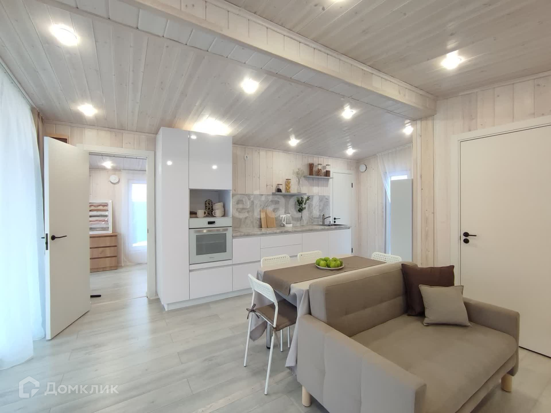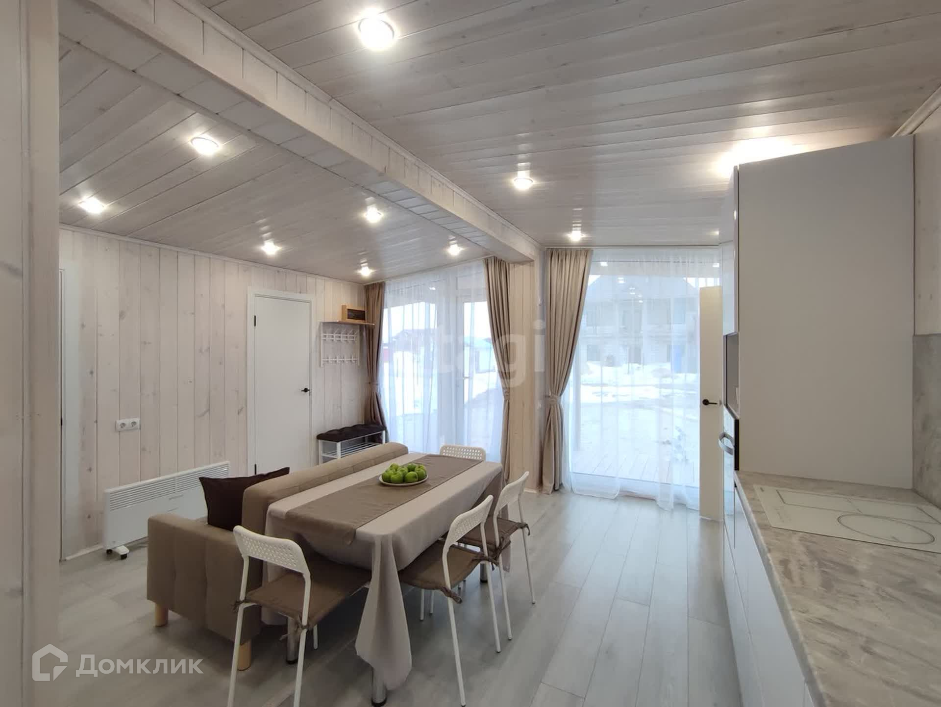 Большая кухня-гостиная с обеденной зоной и панорамными окнами даёт ощущение пространства и непременно станет излюбленным местом сбора всей семьи. Три спальных комнаты, в одной из которых по желанию можно сделать рабочий кабинет или библиотеку. Отдельная гардеробная в гостиной позволит грамотно организовать хранение вещей с максимальным удобством и сэкономить жилое пространство. Санузел в доме имеет правильную форму, где можно развернуть всю сантехнику так, как будет удобно. В доме выполнены электрическая и сантехническая разводка с использованием только качественных материалов. Установлен септик с биологической очисткой, не требующий ежемесячного обслуживания. Сам участок находится в собственности. Добраться до города можно за 5 минут, т.к. дом находится всего в трех километрах. Новый дом с хорошими дружелюбными соседями ждёт Вас, звоните!