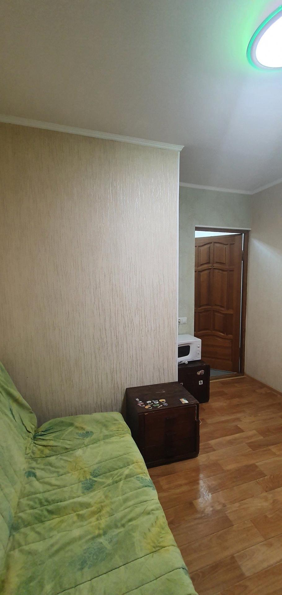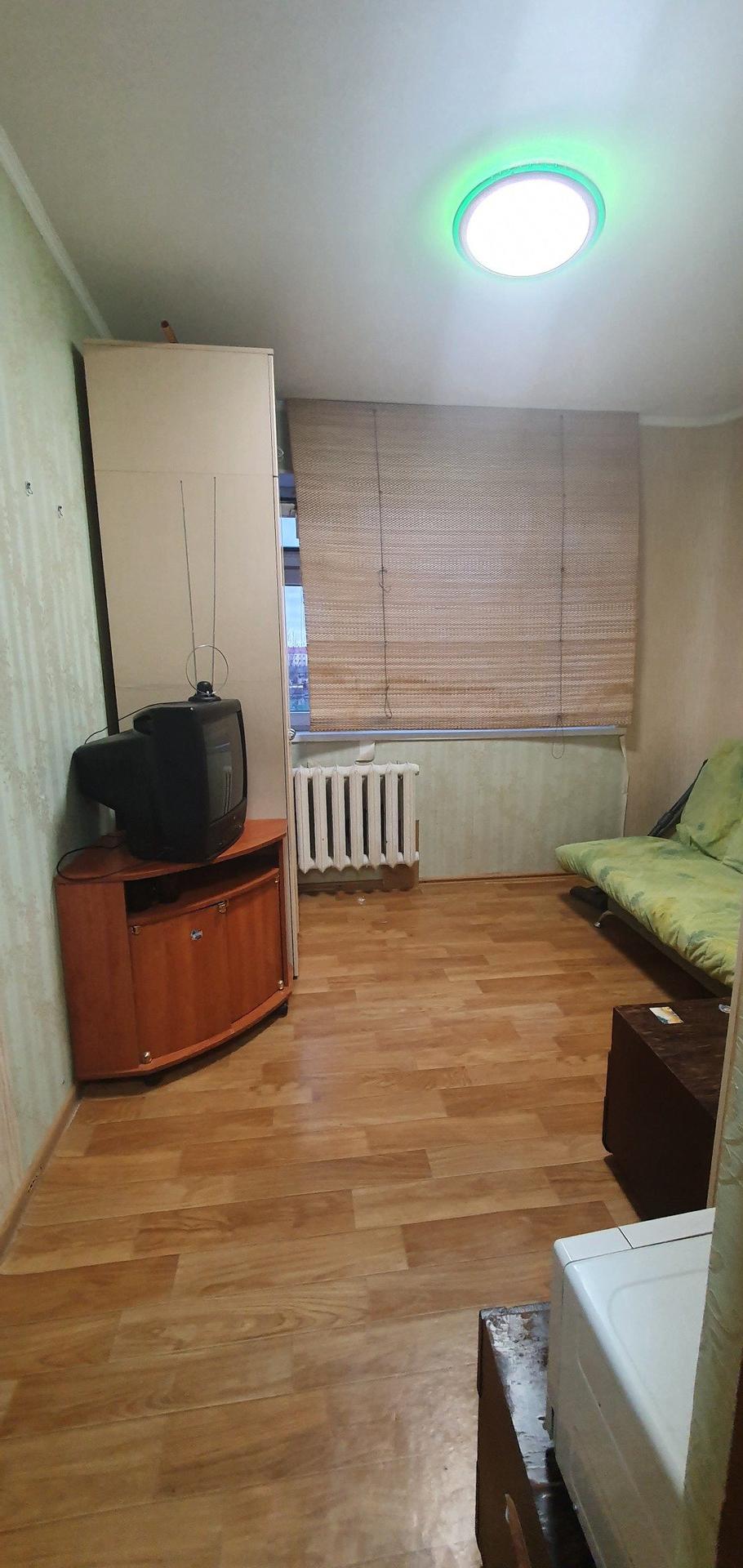 Продается комната с косметическим ремонтом. Окно пвх. хорошая транспортная развязка.  две комнаты. Одна из них продаётся. Во второй практически никто не живёт.Санузел на 2 комнаты и общий коридор.Напротив есть общая кухня.