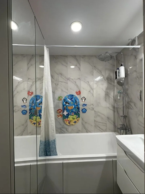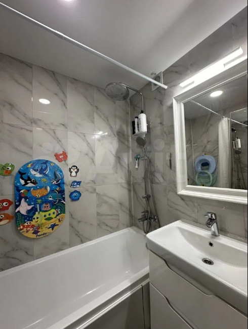 По всей квартире натяжные потолки. В ванной комнате и туалете хорошая керамическая плитка.