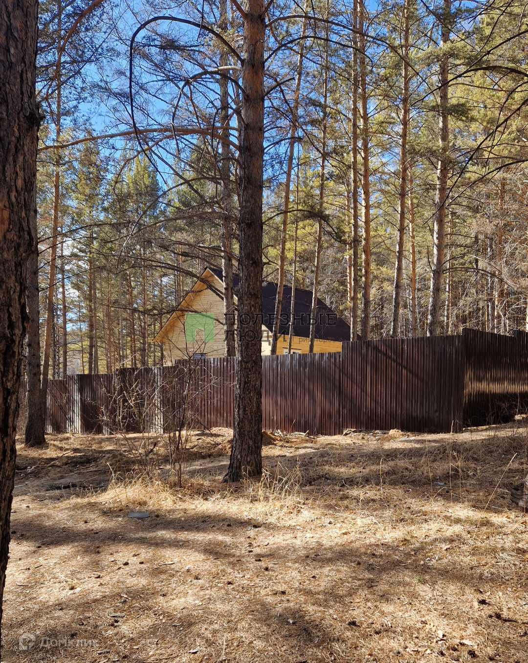 Огорожен металлическим  профлистом и  железными столбами, ворота откатные.