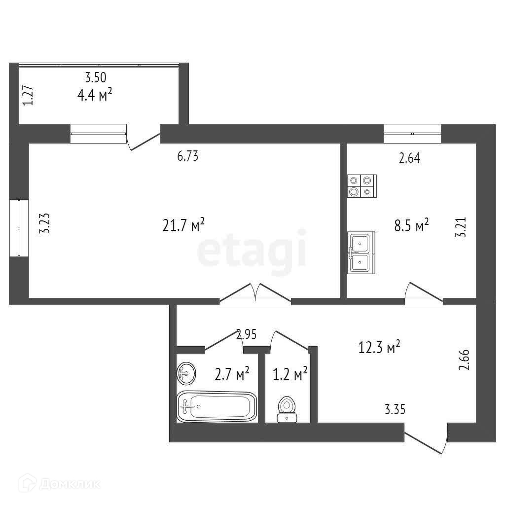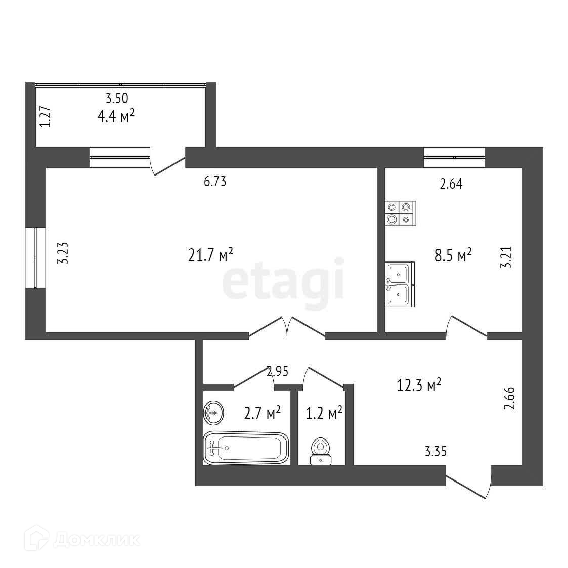 Общая площадь 52.4 м2