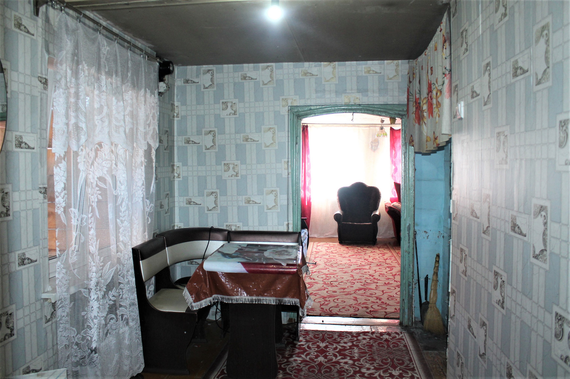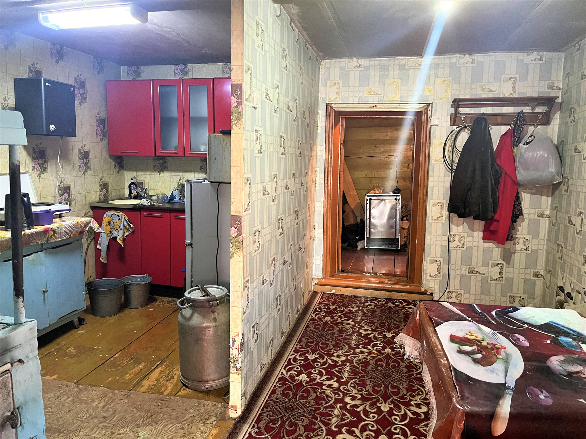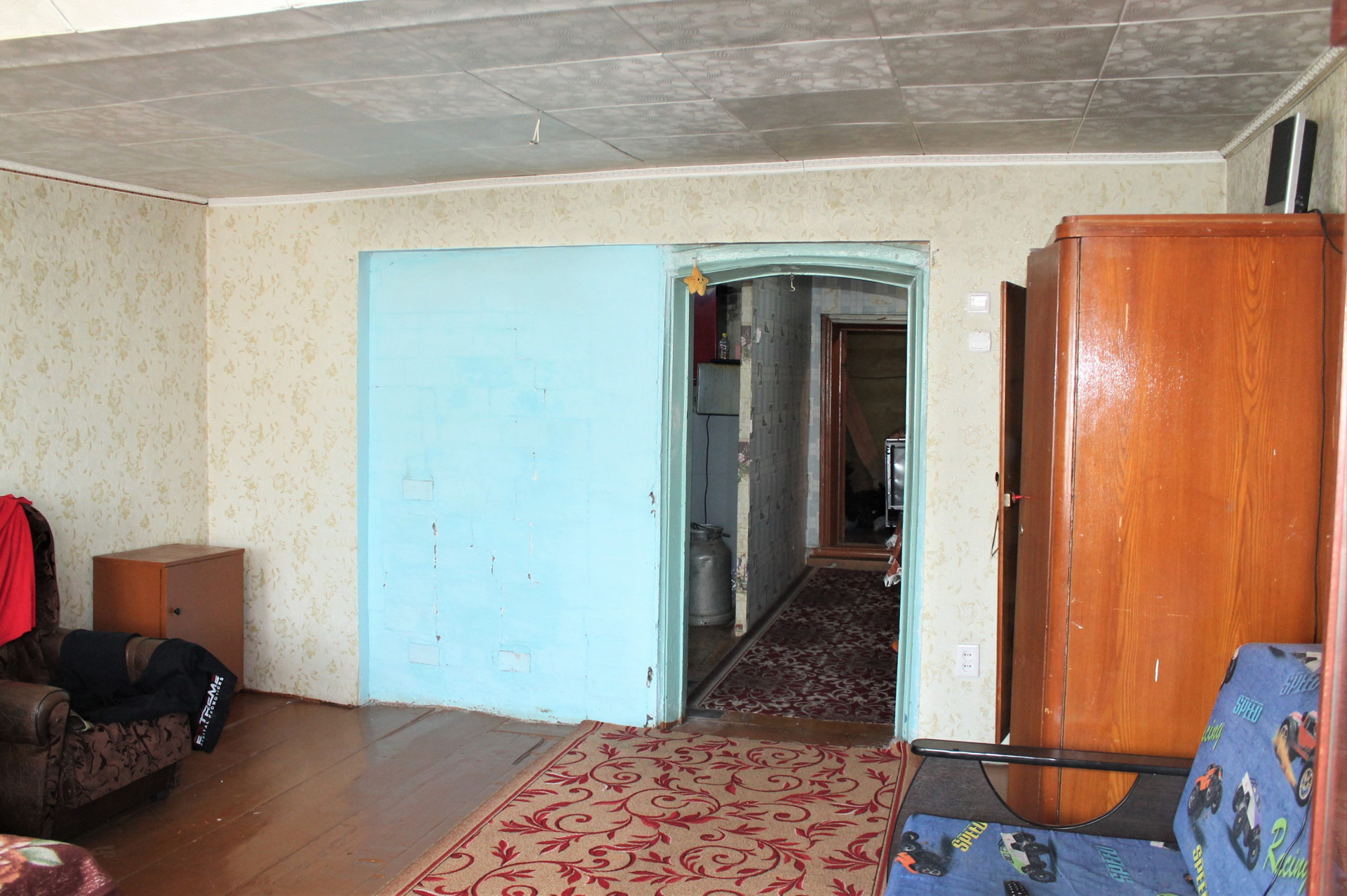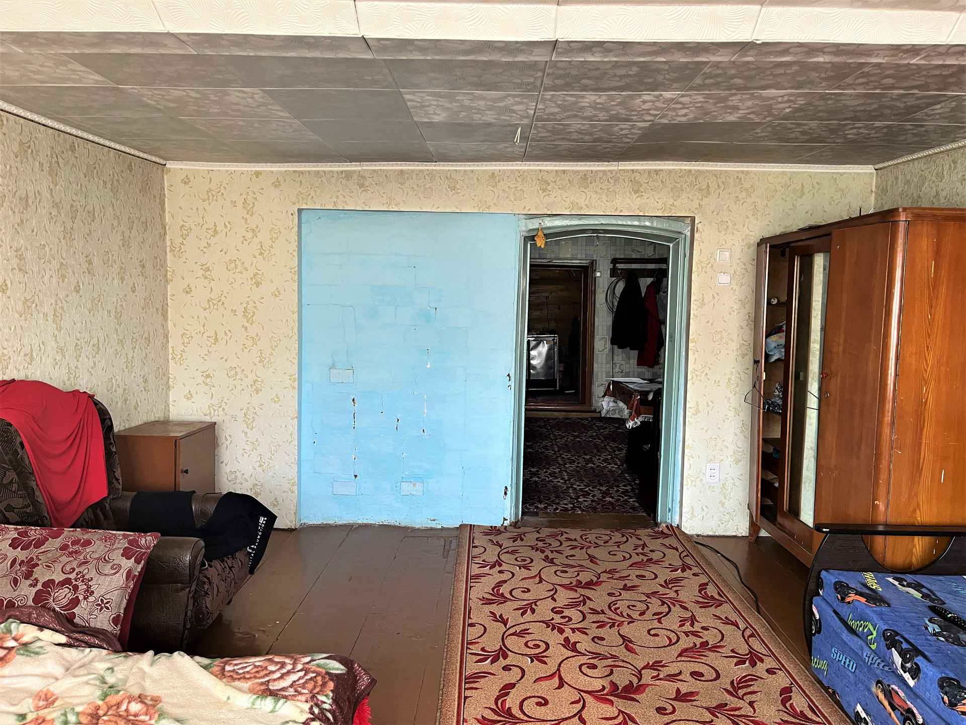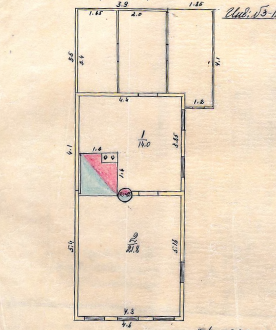 Площадь 46.1 кв.м на участке 992 кв.м. Комната 21.8 кв.м. Кухня-прихожая 14 кв.м. Высота потолков 2.25 м.