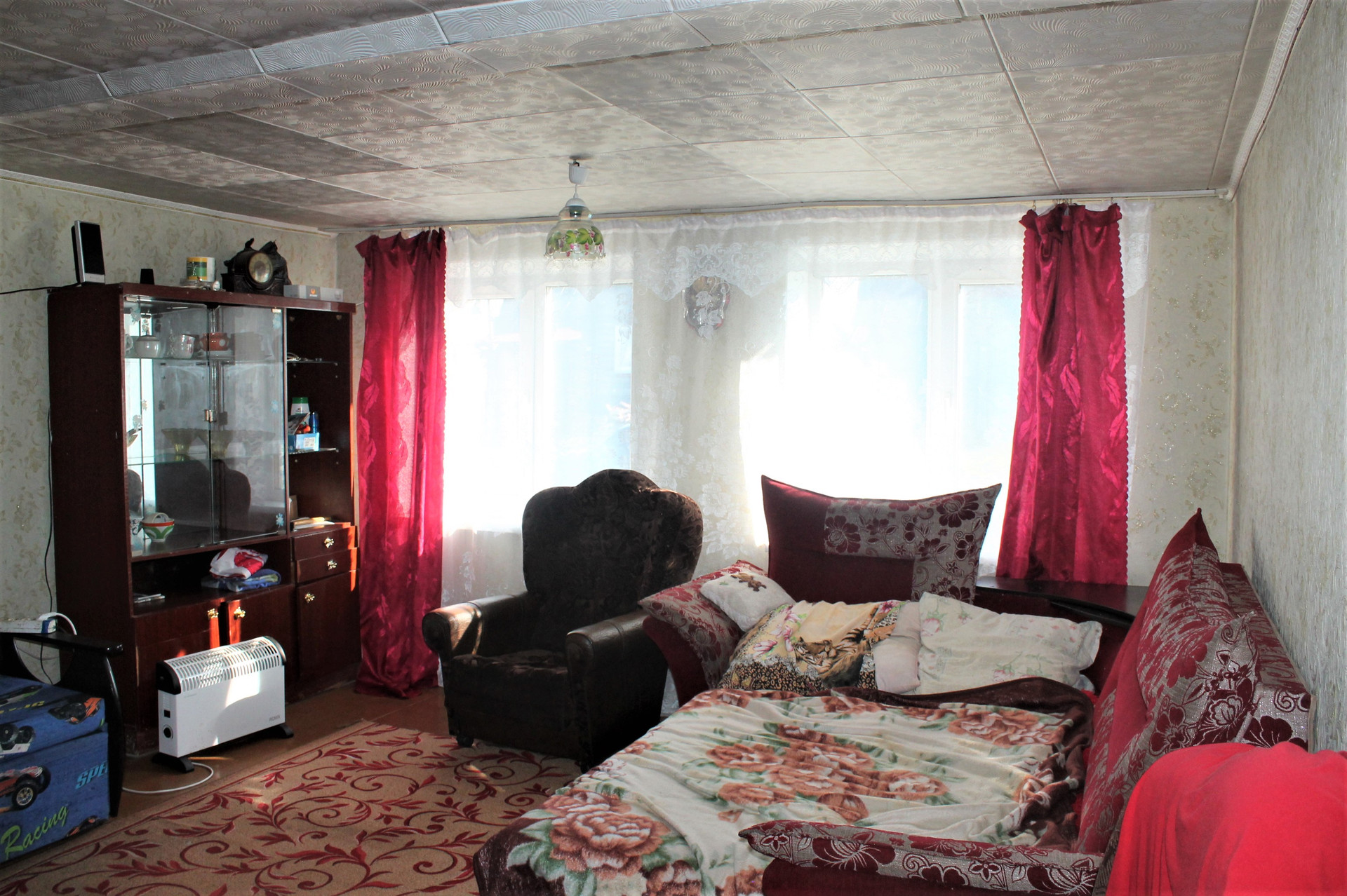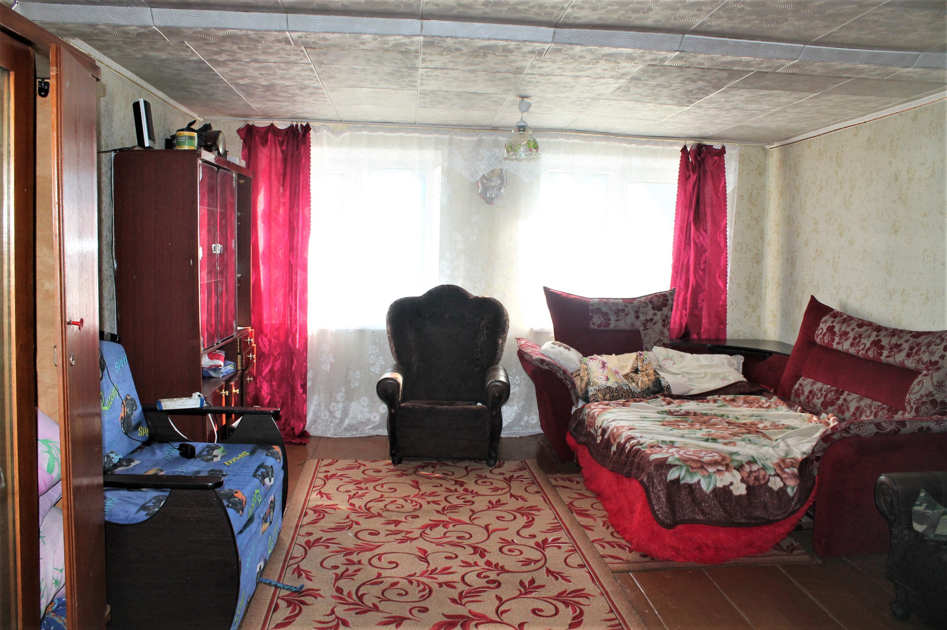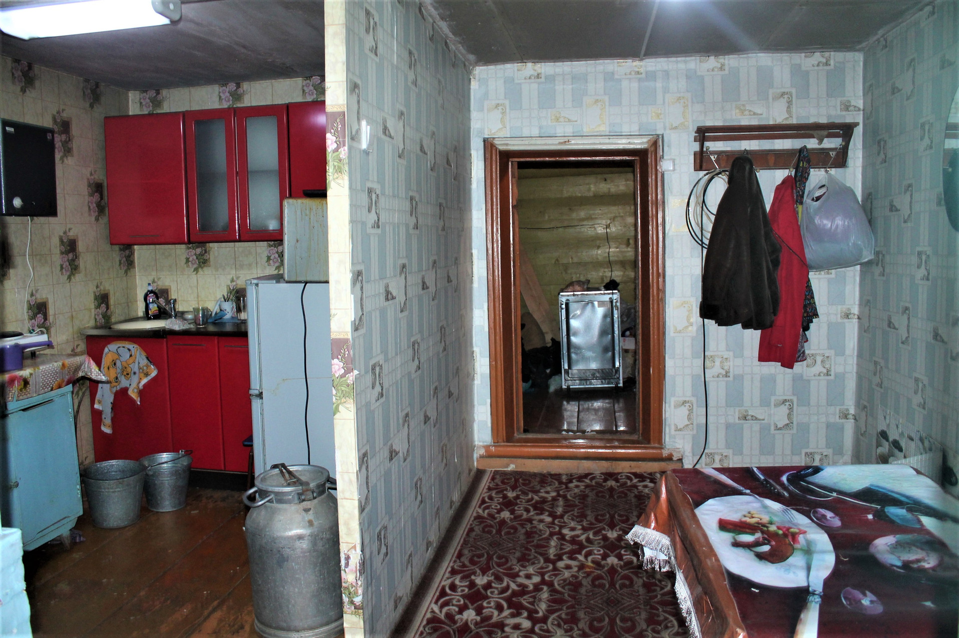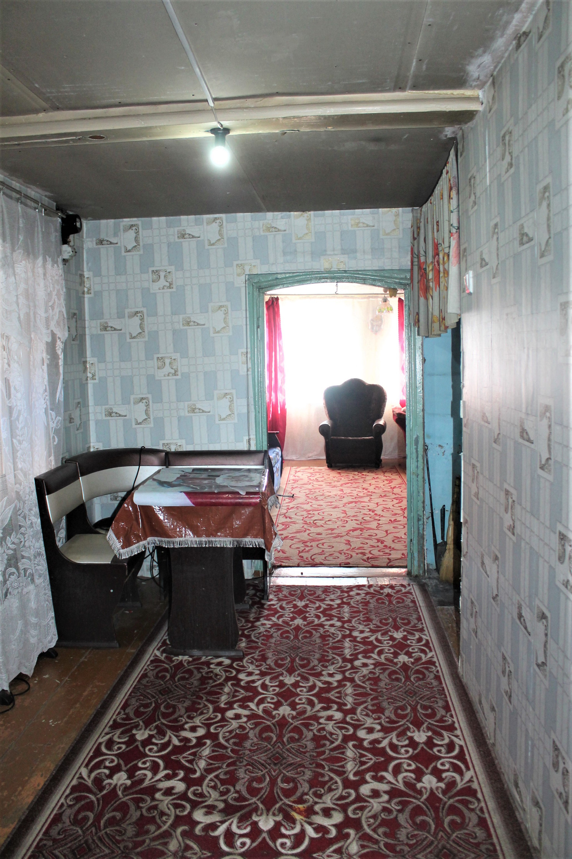 Площадь 46.1 кв.м на участке 992 кв.м. Комната 21.8 кв.м. Кухня-прихожая 14 кв.м. Высота потолков 2.25 м.
