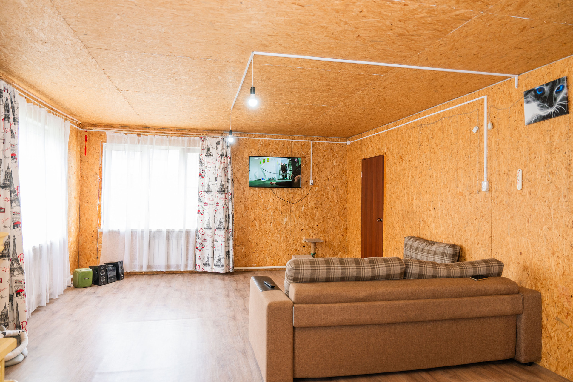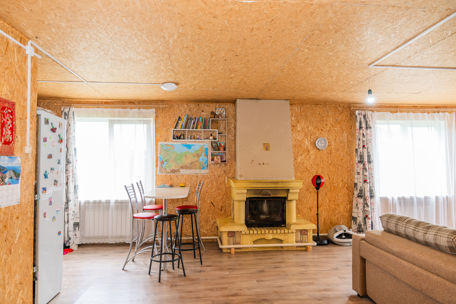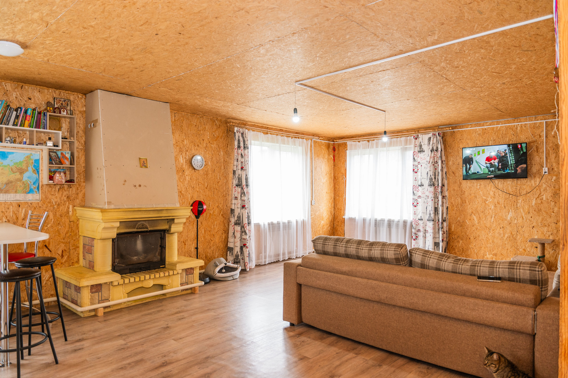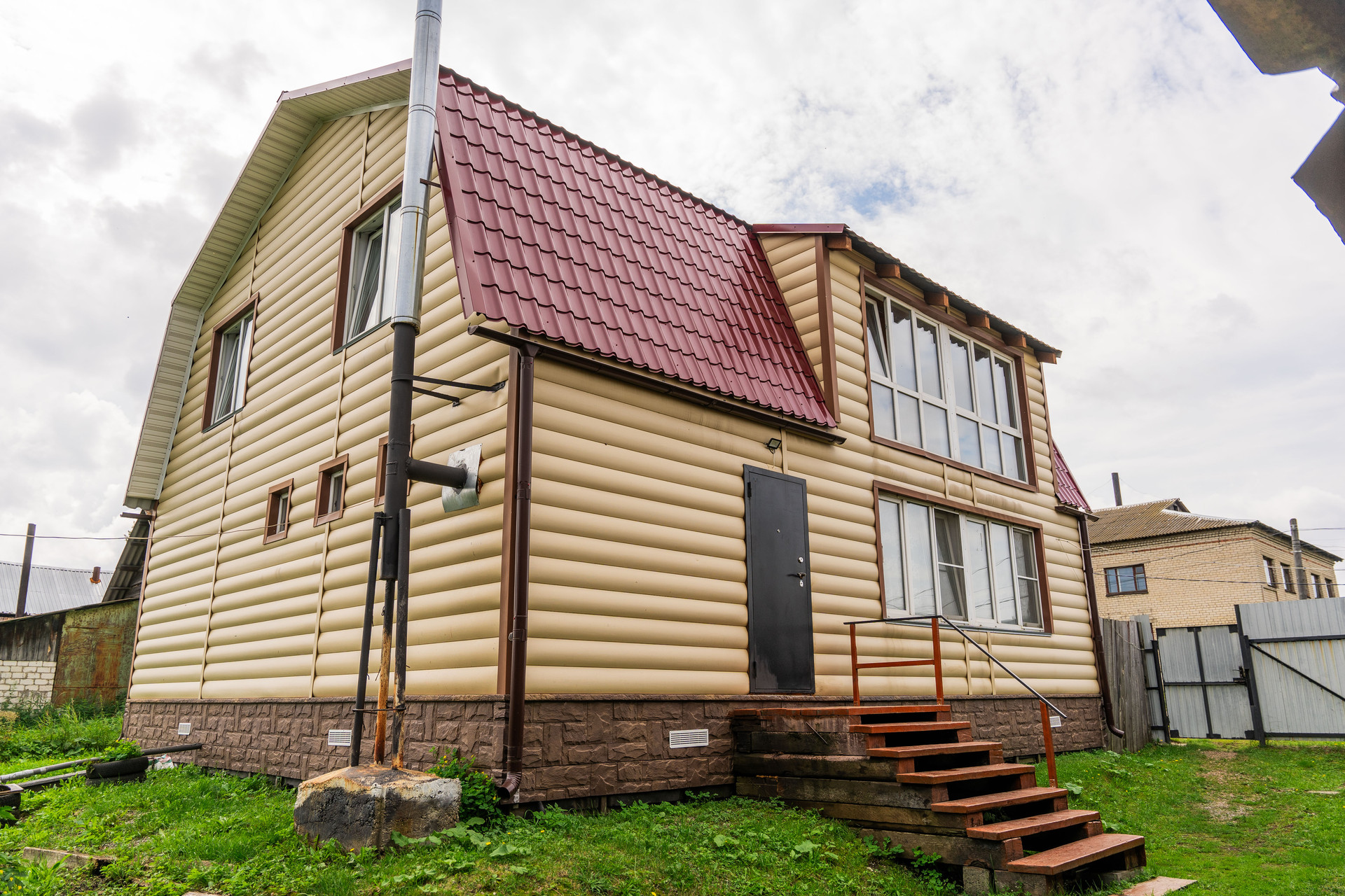 Дом снаружи отделан сайдингом в виде имитации бруса. В доме 2013 года постройки установлены тройные стеклопакеты с москитными сетками, сделана разводка теплоносителя радиаторами, сделана разводка новой электрики, есть канализация, водоснабжение центральное, высокие трехметровые потолки, санузел раздельный. Дом каркасный на сваях, полностью подготовлен под чистовую отделку. Полы устланы линолеумом. Первый этаж включает в себя просторную кухню гостиную с камином, санузел с ванной и гардеробную. На втором этаже: балкон лоджия с качественным зимним стеклопакетом, три комнаты. Продается полностью с мебелью, что позволяет сразу заехать и жить с минимальным набором удобств. Кухонный гарнитур, барная стойка, диван остаётся в подарок будущим владельцам.