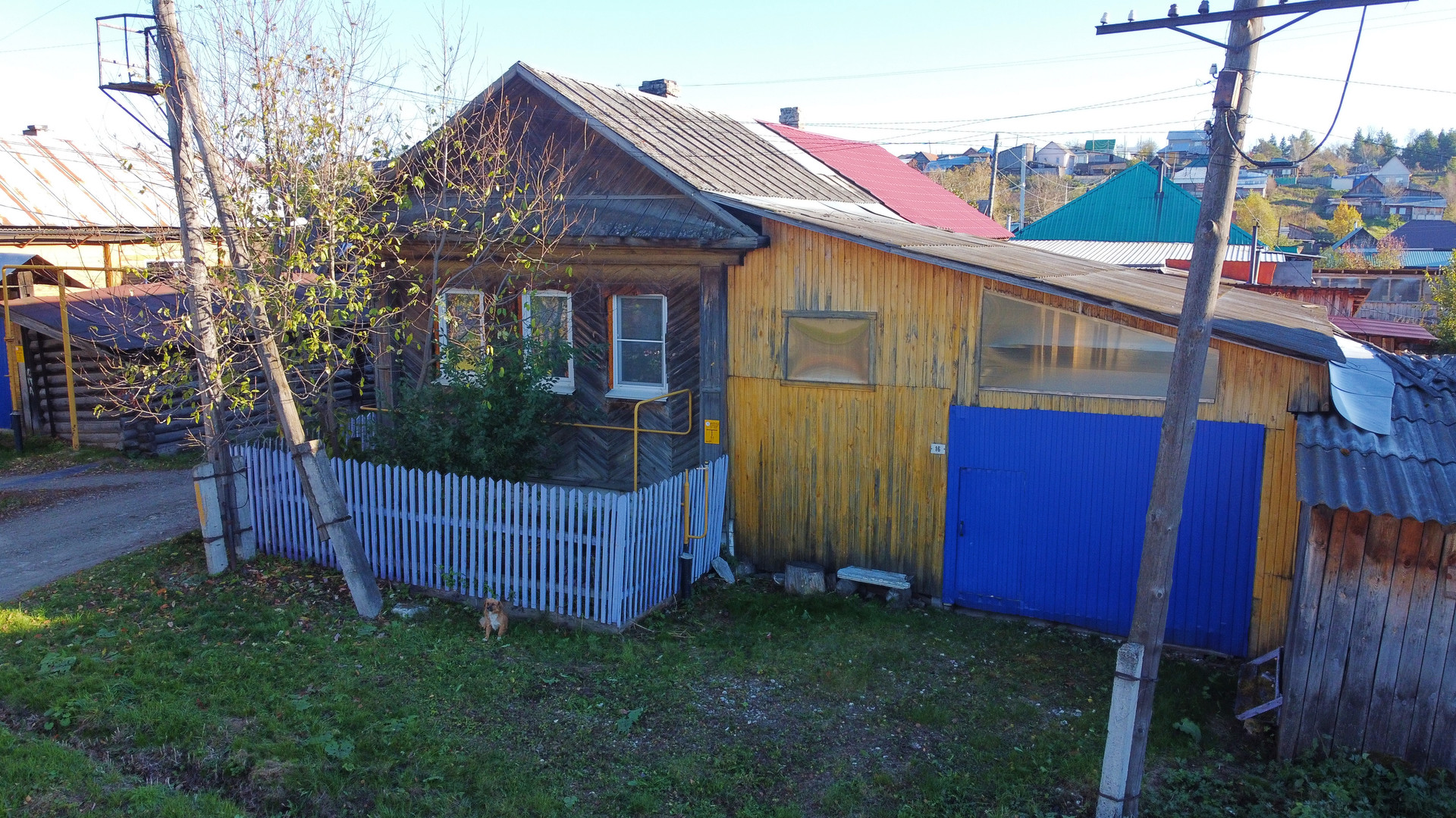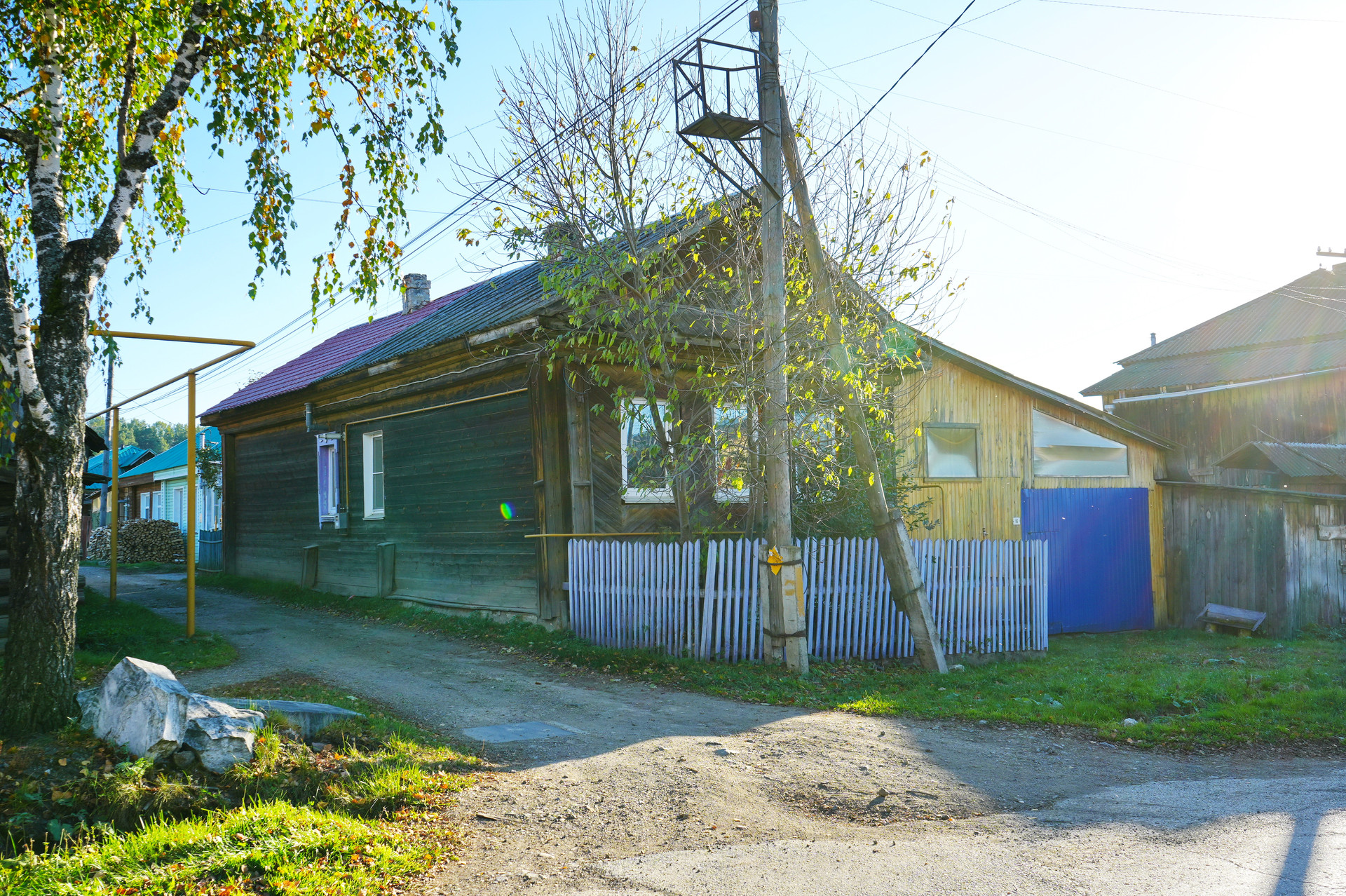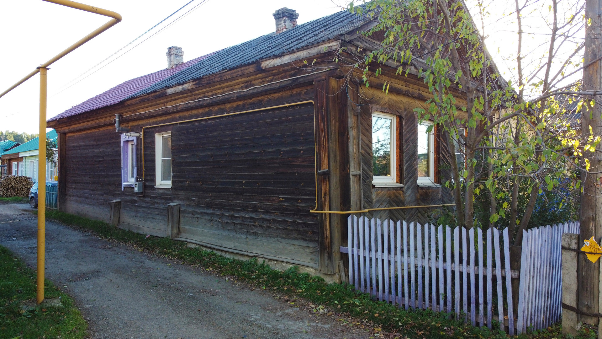 У дома имеется просторный крытый двор, палисадник, а также подсобные хозяйственные помещения. Крыша дома покрыта профлистом. На участке площадью 109 квадратных метров расположена канализация и возможность подключения к газовому снабжению, так как улица газифицирована и стояк газа выведен к дому. Высокий крепкий фундамент, сруб у дома ровный.