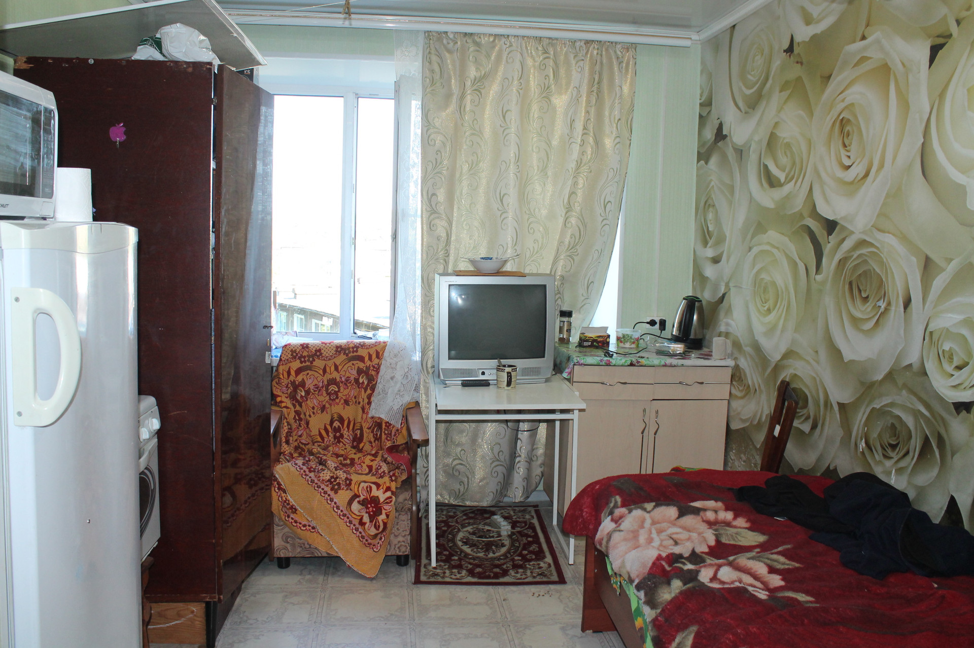 Установлено евроокно. Натяжной потолок. Линолеум. Частично панели.