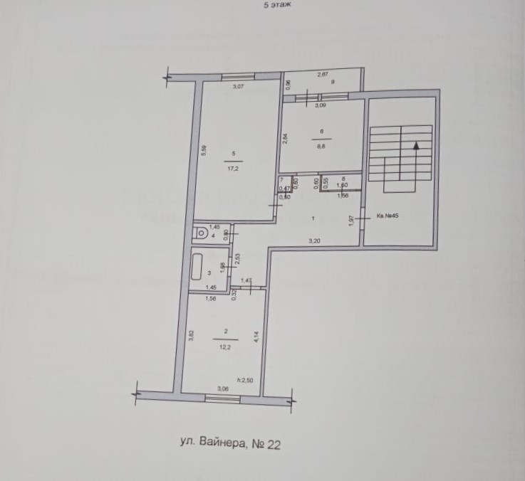 5/5 этаж. Площадь 53.6 кв.м. 2 раздельные комнаты: 17.2 и 12.2 кв.м. Кухня: 8.8 кв.м. Высота потолков 2.5м.