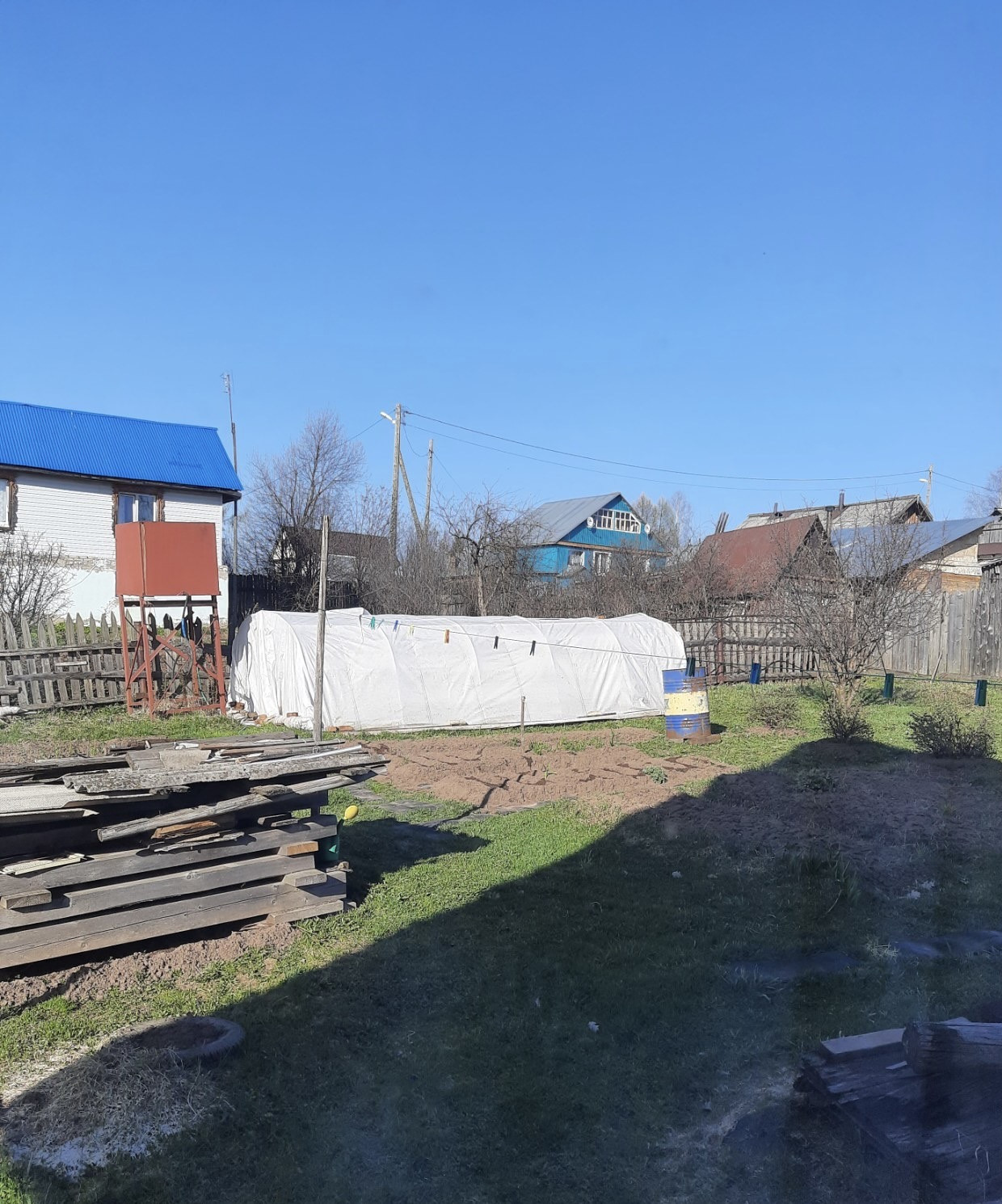 Есть бак двухкубовый для полива, теплица с укрывным материалом, есть стройматериалы для любителей мастерить и строить самим.