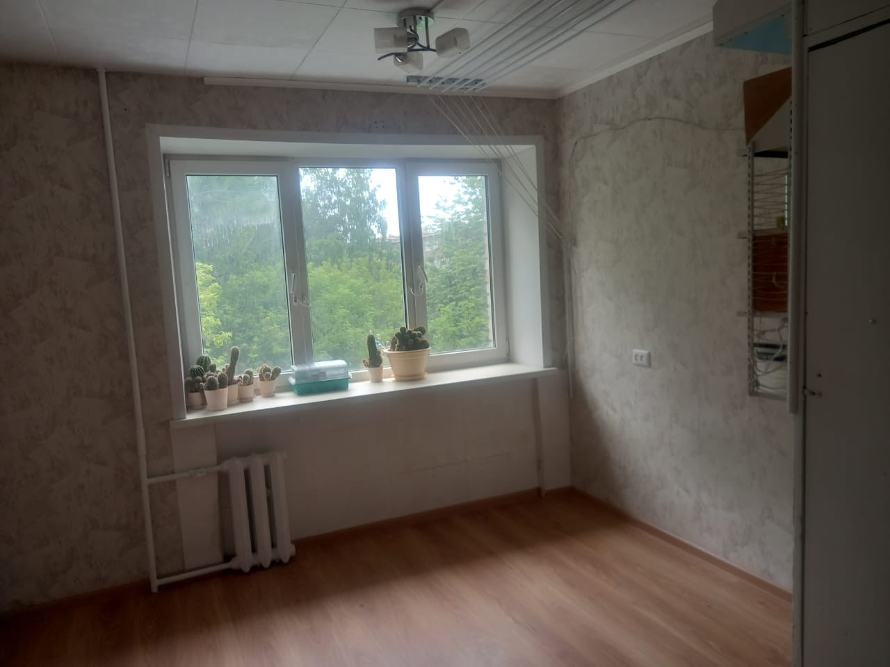 В комнате заменена проводка.  Окно пластиковое. Стоит электросчетчик. Требуется косметический ремонт.
