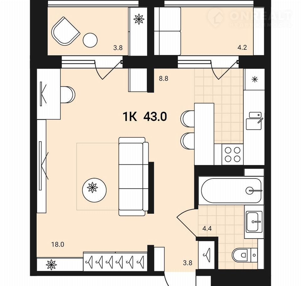 Общая площадь 43 м2