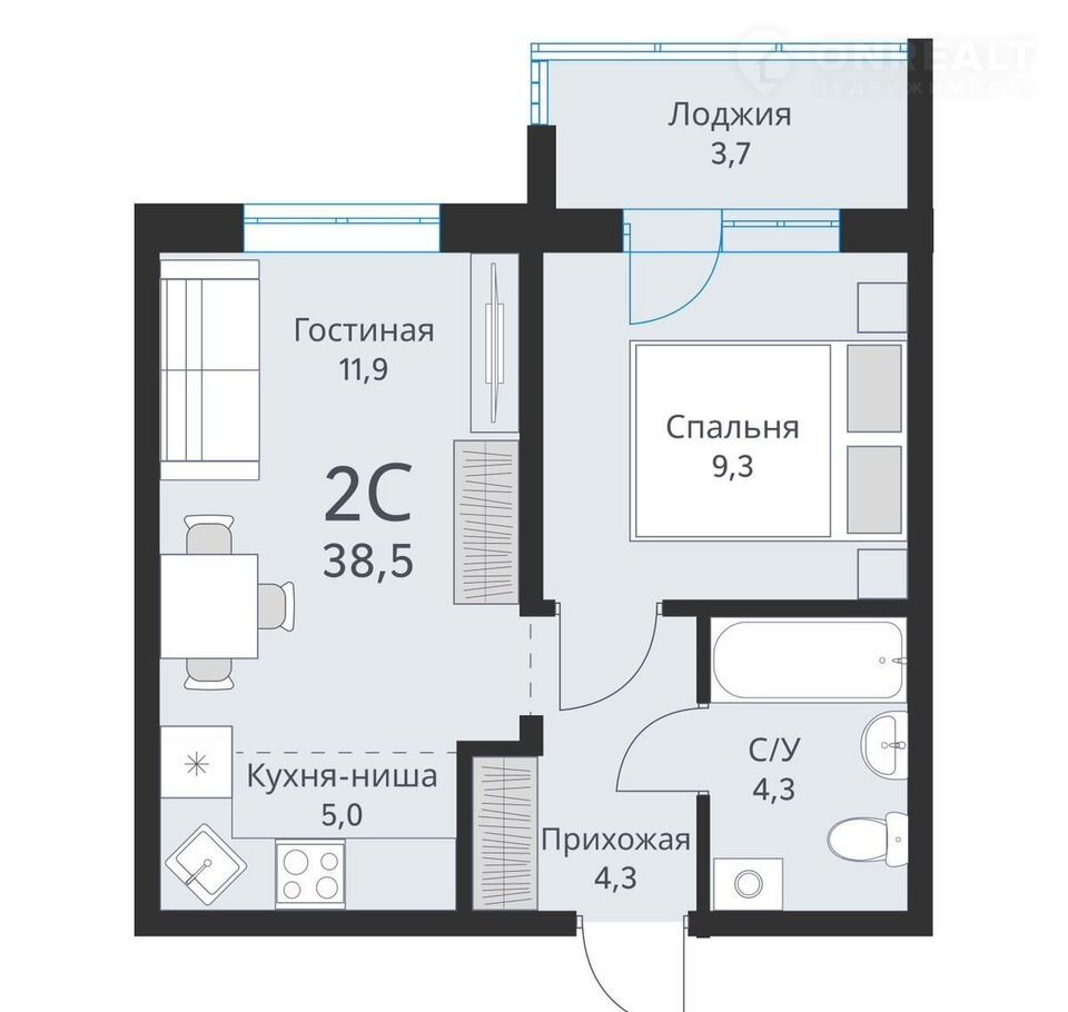 Общая площадь 38.5 м2