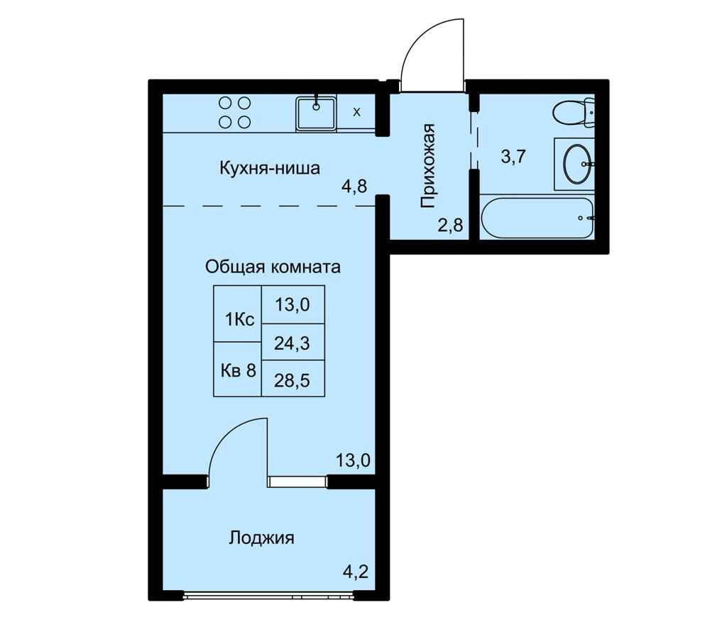 Общая площадь 28.5 м2