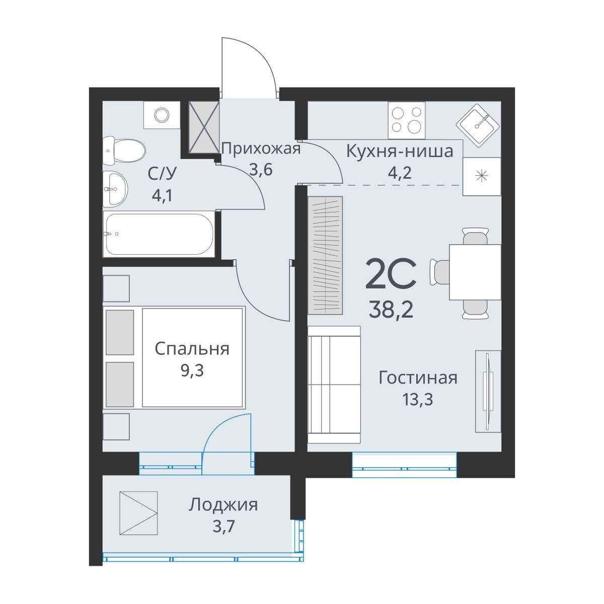 Общая площадь 37.3 м2