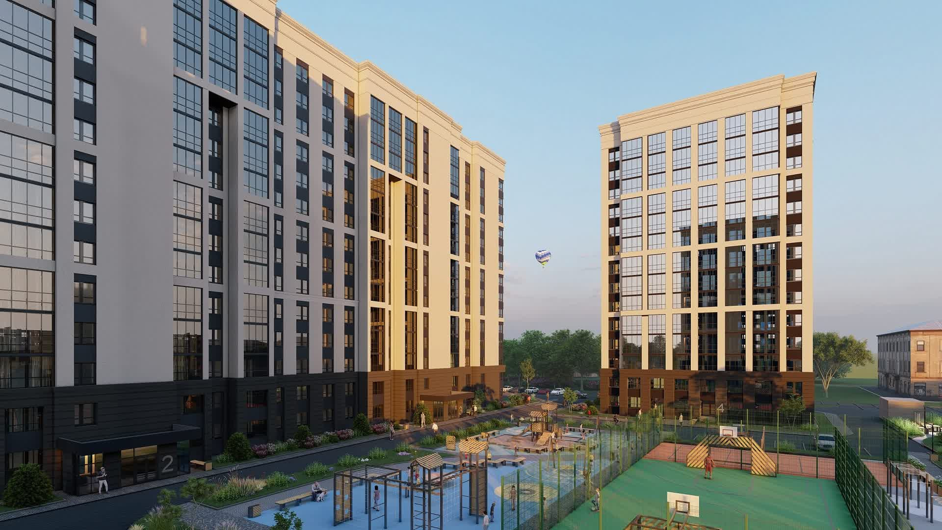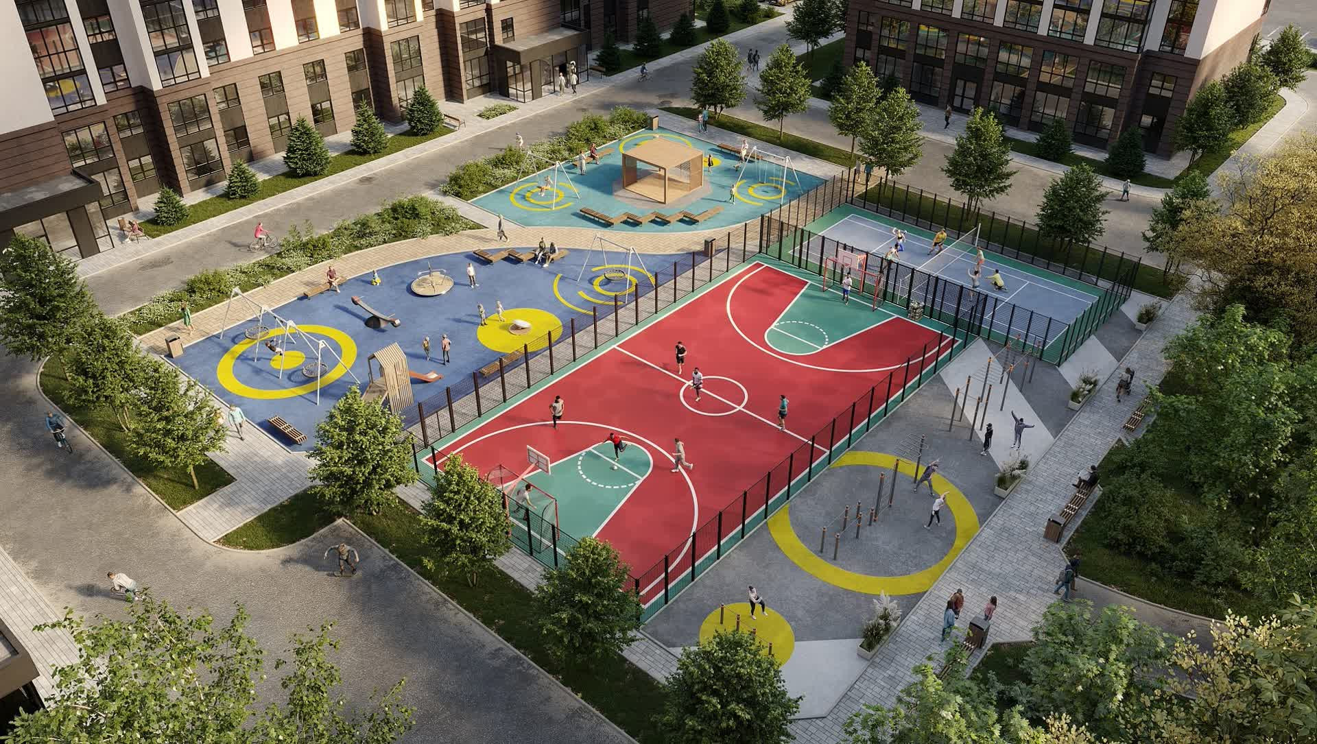 Территория ЖК — благоустроенный просторный парк площадью 1,8 га. На огромной территории комплекса реализован принцип «двор без машин», созданы досуговые зоны с аккуратными скамейками и стильными ландшафтными композициями. Детей разных возрастов будут ждать игровые городки с травмобезопасным покрытием, а взрослых — спортивные площадки и барбекю-зоны для встреч с родными и близкими. Территория комплекса безопасна: рядом нет шумных дорог, установлены камеры видеонаблюдения.