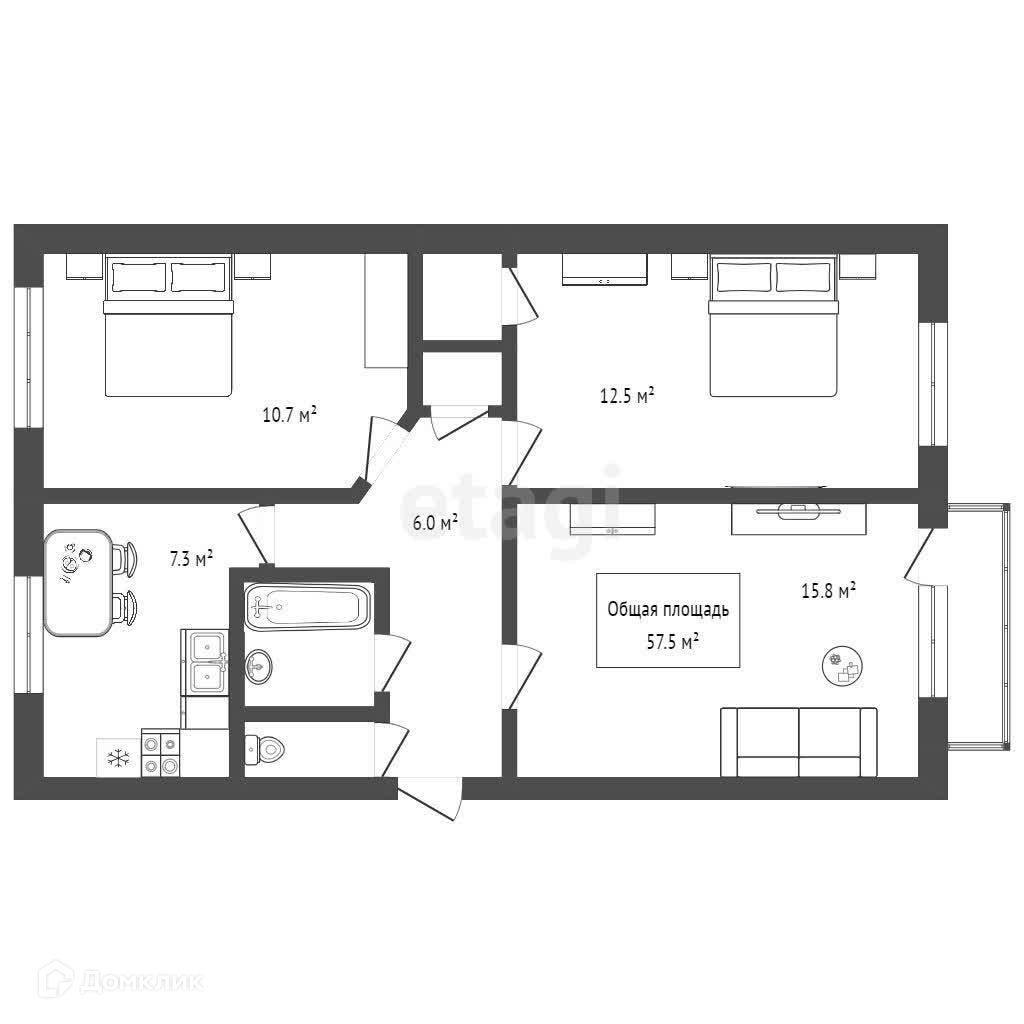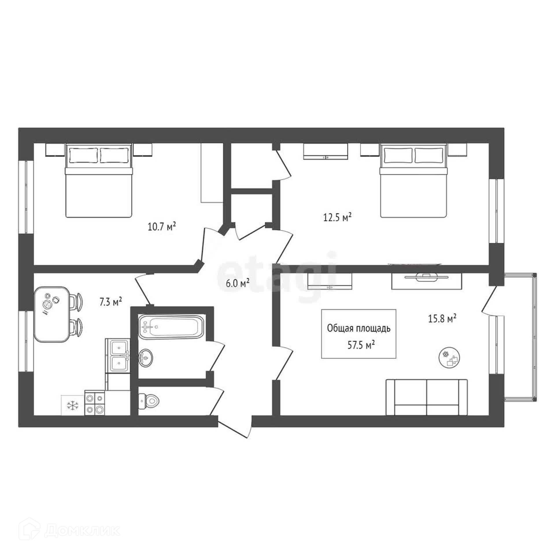 Общая площадь 57.5 м2