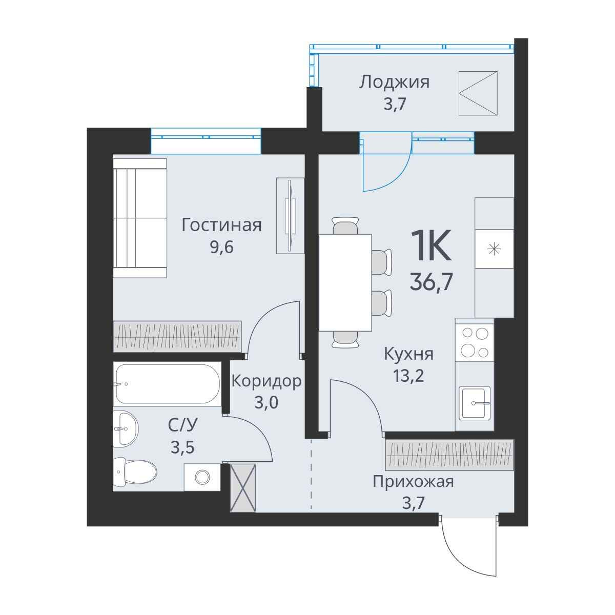 Общая площадь 36.7 м2
