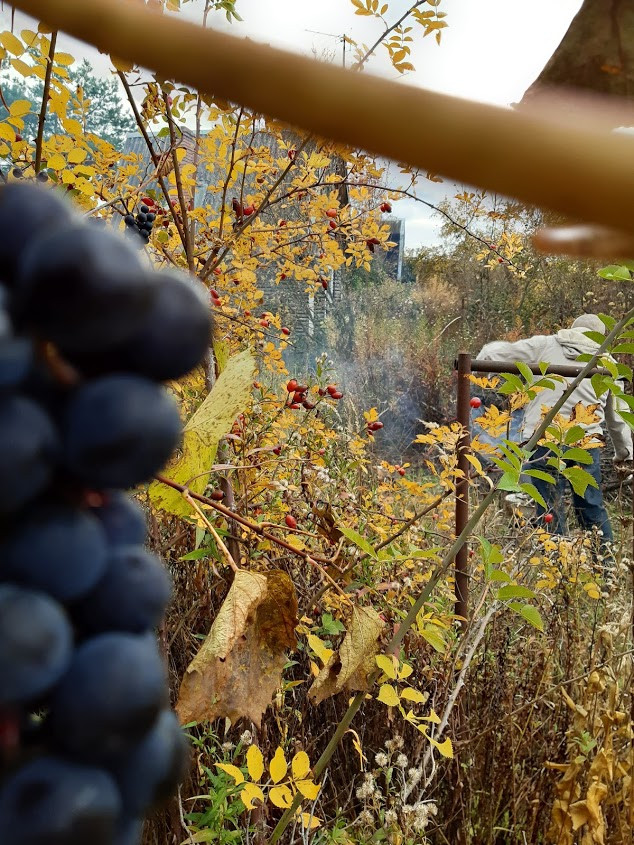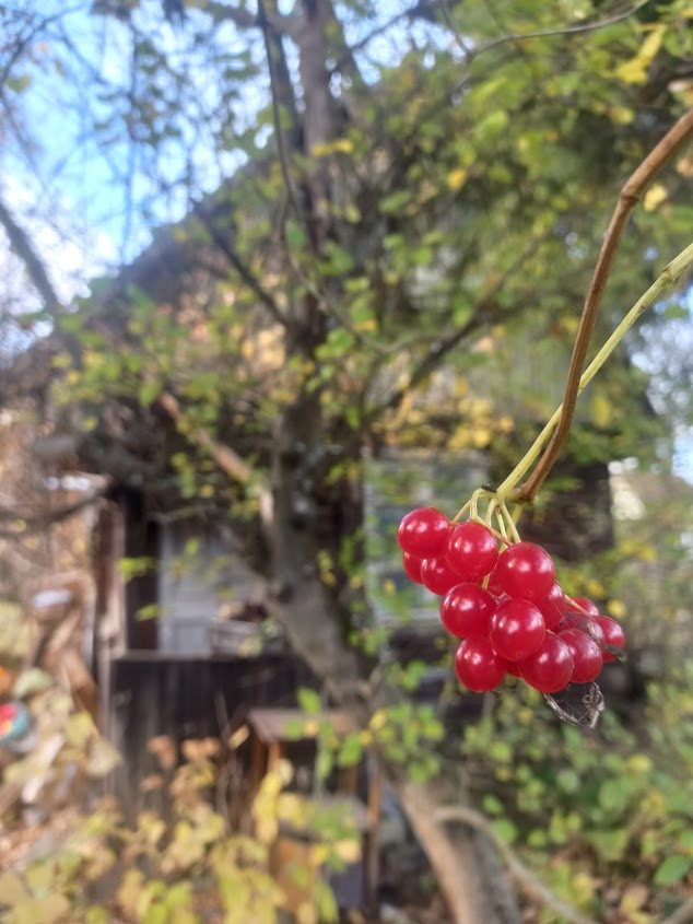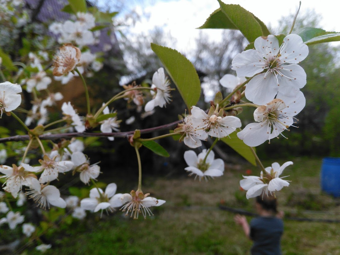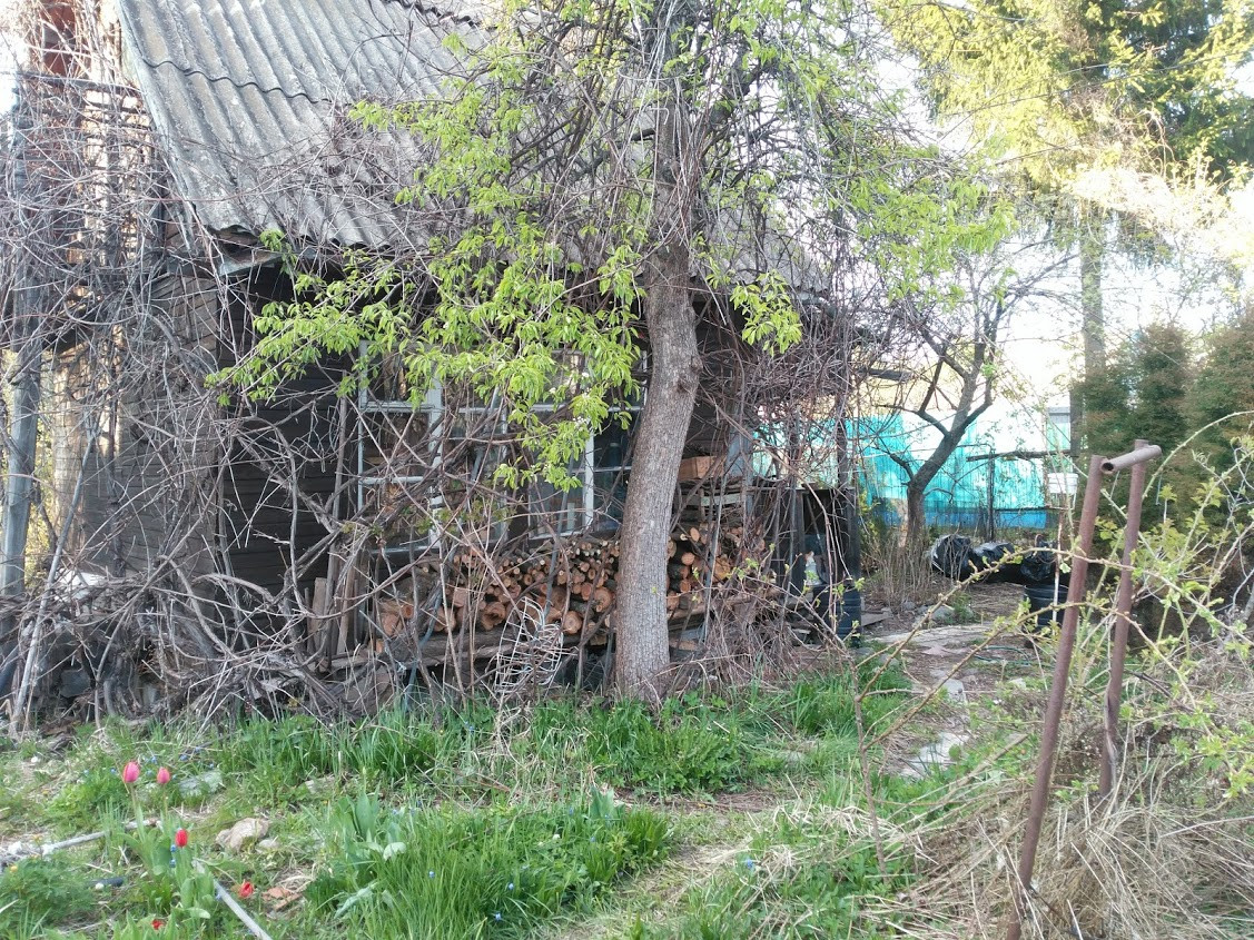 Вокруг дружелюбные приветливые соседи. Плодоносящий грецкий орех, вишни, жимолость, виноград Изабелла, актинидия, калина, шиповник. Первоцветы, сирень, пионы.
