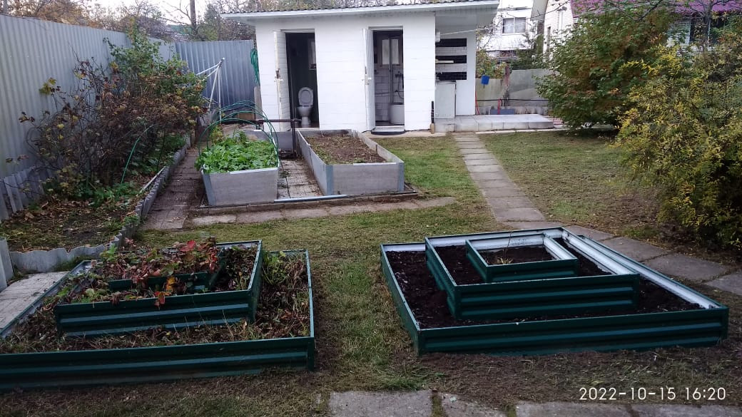 Есть маленький огородик с двумя вертикальными многоярусными металлическими грядками (под клубнику) и двумя высокими грядками под выращивание томатов, огурцов или зелени. Грядки прополоты, заполнены плодородной почвой и готовы к дачному сезону.