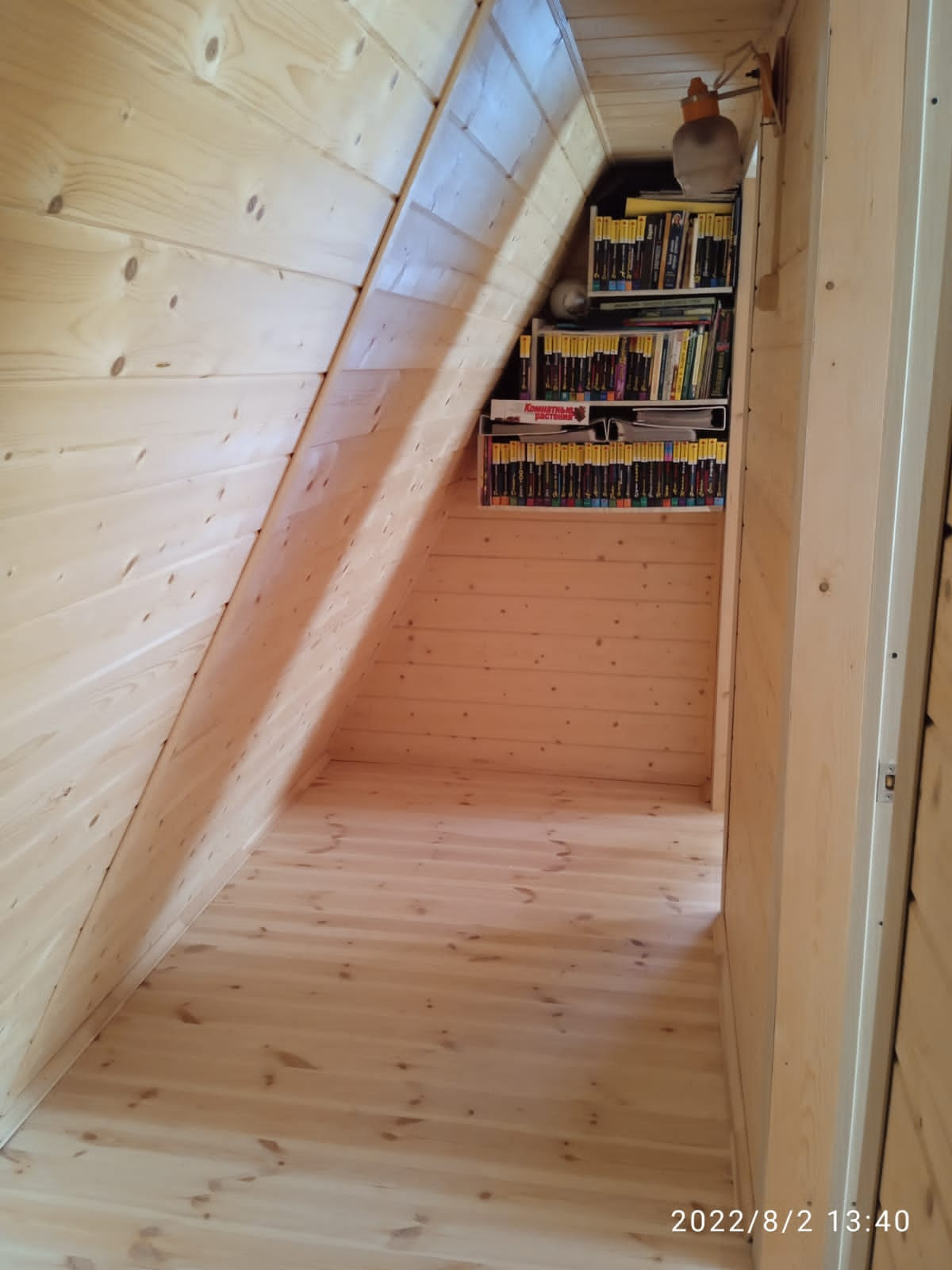 На втором этаже две спальни. Они также полностью отделаны деревом (вагонкой натурального цвета), а огромные пластиковые окна расположены практически "в пол" и выходят на юго-восточную сторону. За счёт этого в комнатах всегда приветливо светло, даже в непогоду.