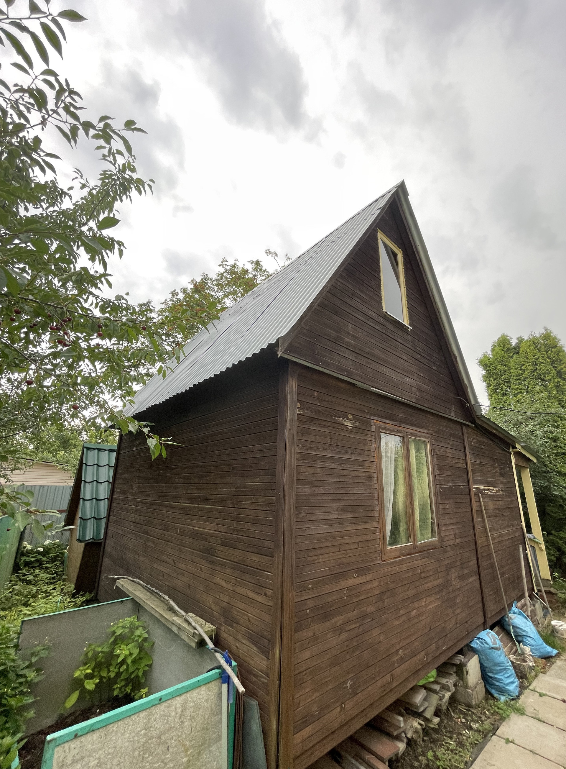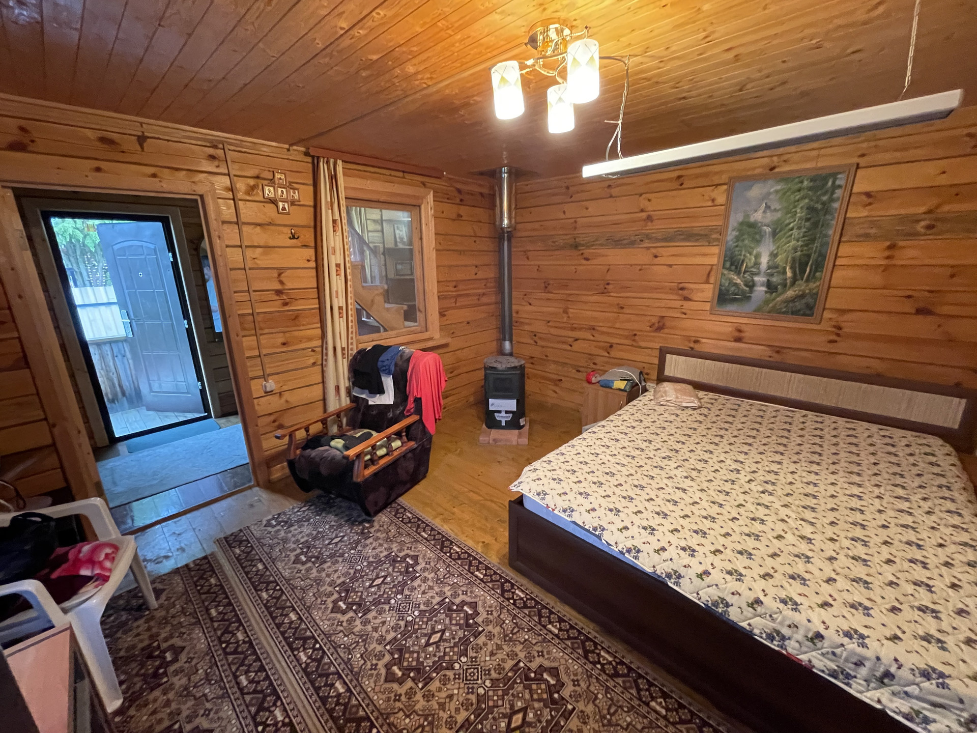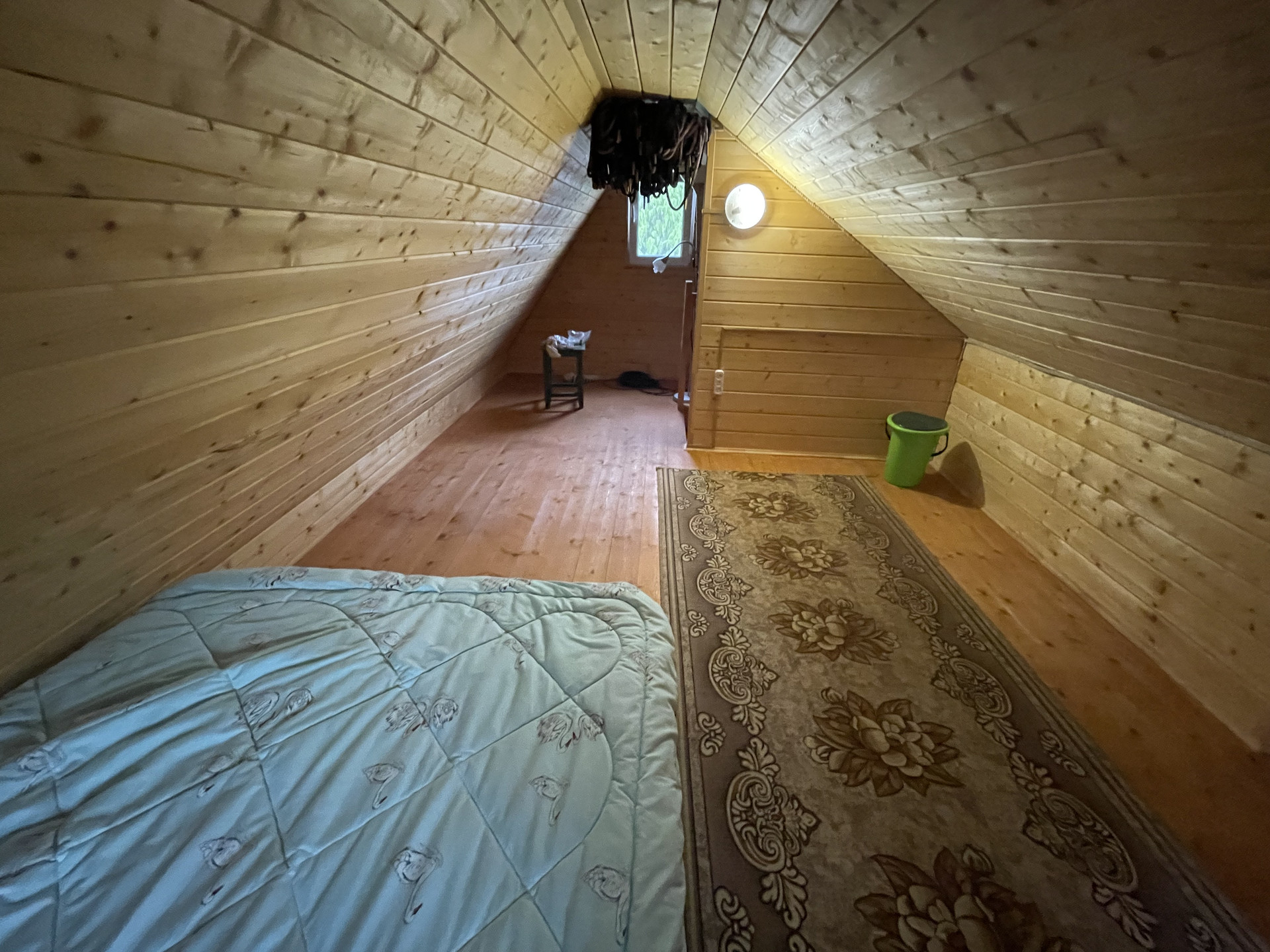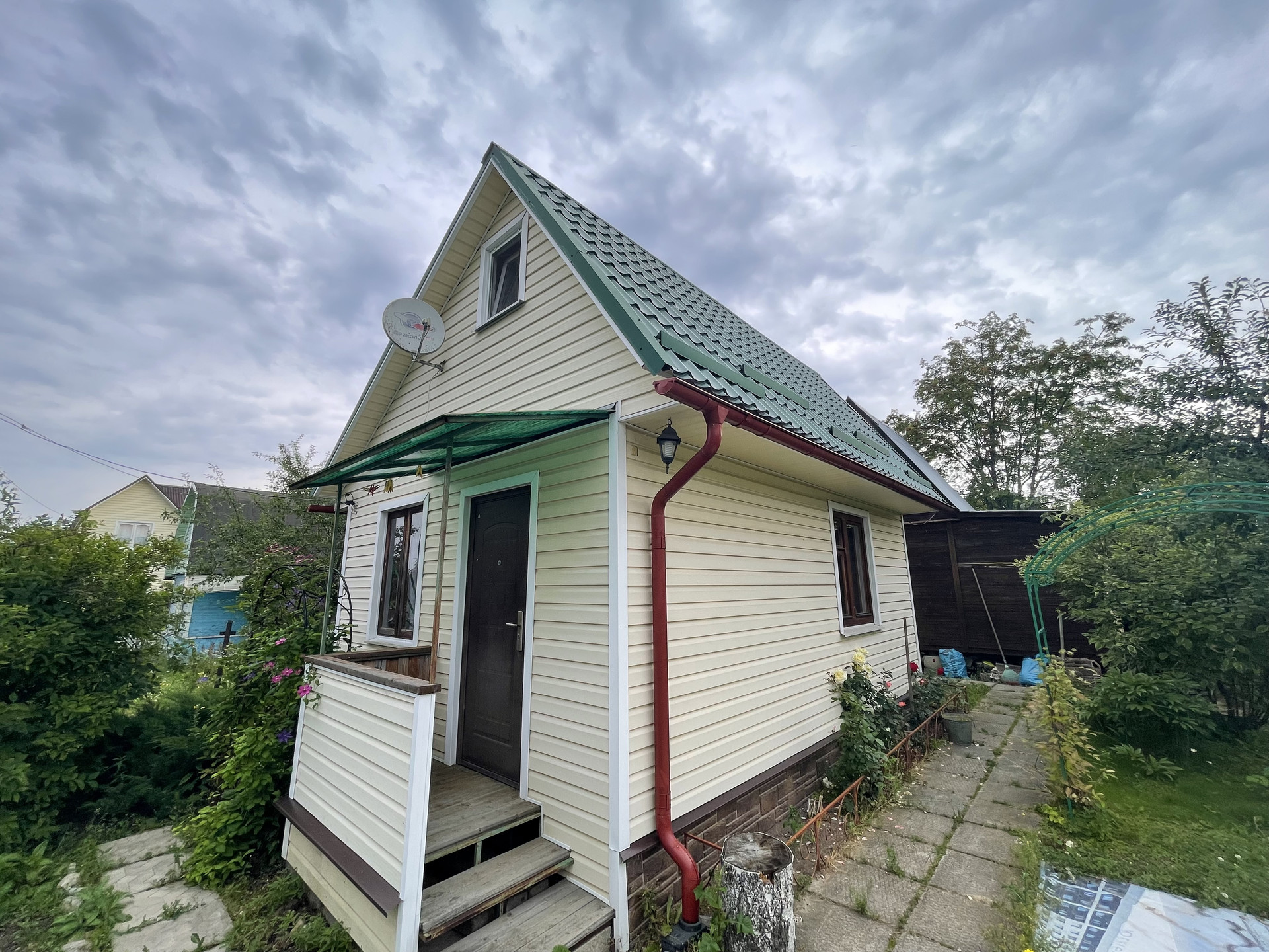 Крыша металлочерепица, окна 2-е деревянные и ПВХ, фундамент – плита, снаружи дом обит сайдингом, внутренняя отделка - вагонка, деревянная лестница. Дом полностью готов к сезонному проживанию, планировка 1 эт.: прихожая с лестницей на 2 эт., комната отдыха с печью; 2 эт. одна комнат. Подключен свет 5 кВт с разводкой по дому, установленный эл. обогреватели, ТВ антенна.