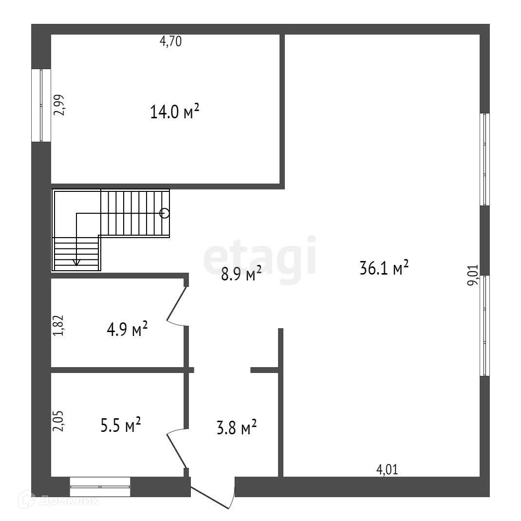 На первом этаже: кухня -гостиная 36,1 м2, спальная комната 14 м2, совмещенный санузел 5 м2, бойлерная 5,5 м2, холл 12,7.