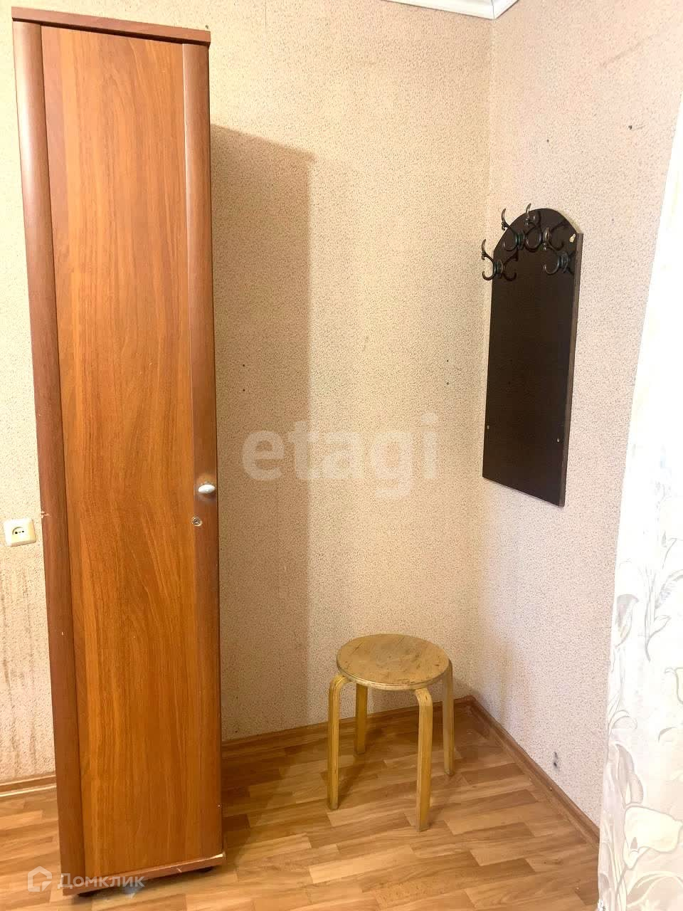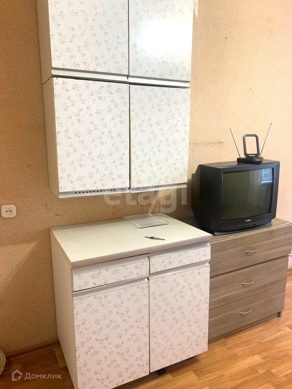 В комнате остается: холодильник, телевизор, софа, шкаф, кухонный гарнитур.